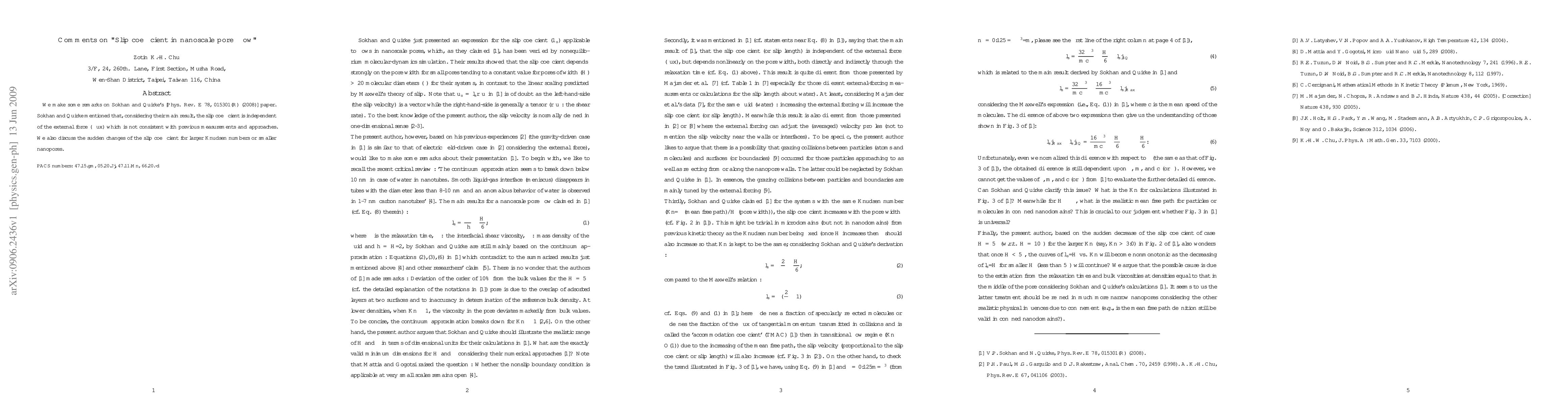 We make some remarks on Sokhan and Quirke's [{\it Phys. Rev. E} 78, 015301(R) (2008)] paper (arXiv:0805.1666). Sokhan and Quirke mentioned that, considering their main result, {the slip coefficient is independent of the external force (flux)} which is not consistent with previous measurements and approaches. We also discuss the sudden changes of the slip coefficient for larger Knudsen numbers or smaller nanopores.