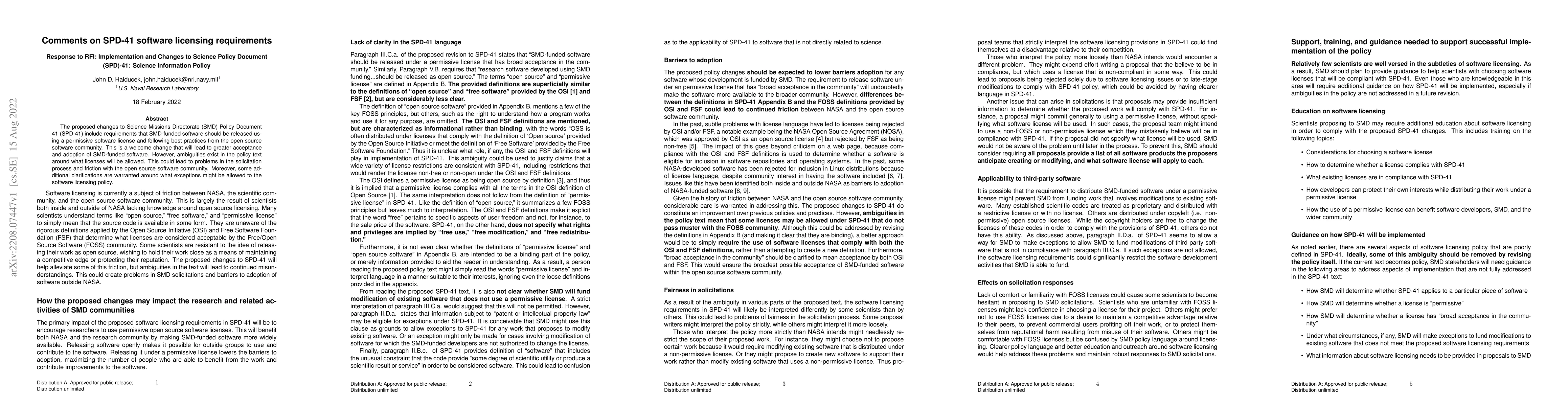 The proposed changes to Science Missions Directorate (SMD) Policy Document 41 (SPD-41) include requirements that SMD-funded software should be released using a permissive software license and following best practices from the open source software community. This is a welcome change that will lead to greater acceptance and adoption of SMD-funded software. However, ambiguities exist in the policy text around what licenses will be allowed. This could lead to problems in the solicitation process and friction with the open source software community. Moreover, some additional clarifications are warranted around what exceptions might be allowed to the software licensing policy.