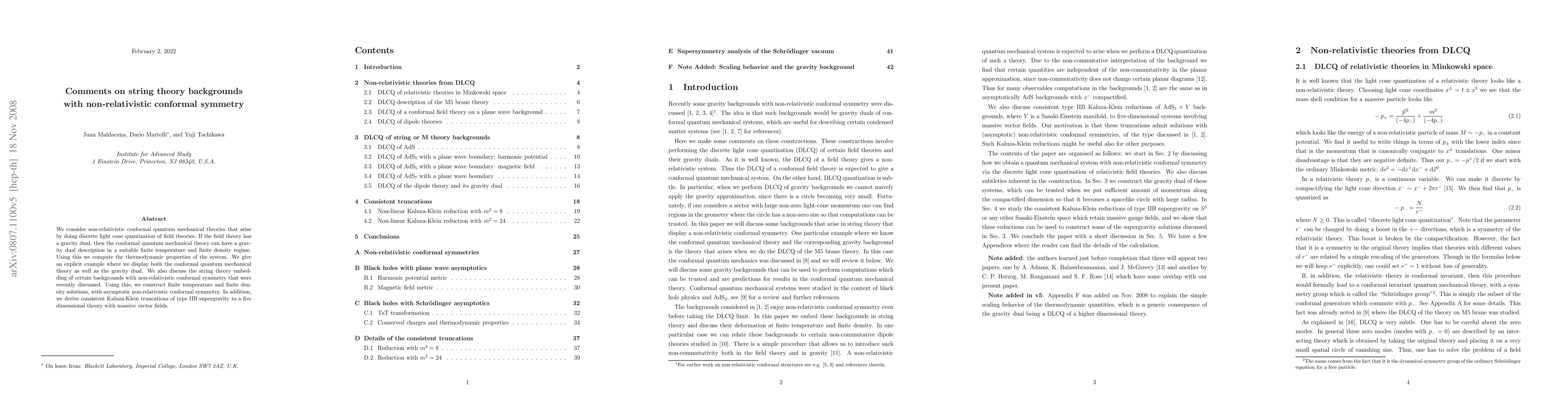 This paper explores non-relativistic conformal quantum mechanics derived from discrete light cone quantization and its gravity dual in finite temperature and density regimes. It provides explicit examples, constructs finite temperature and density solutions, and derives Kaluza-Klein truncations of type IIB supergravity for non-relativistic conformal symmetry backgrounds.