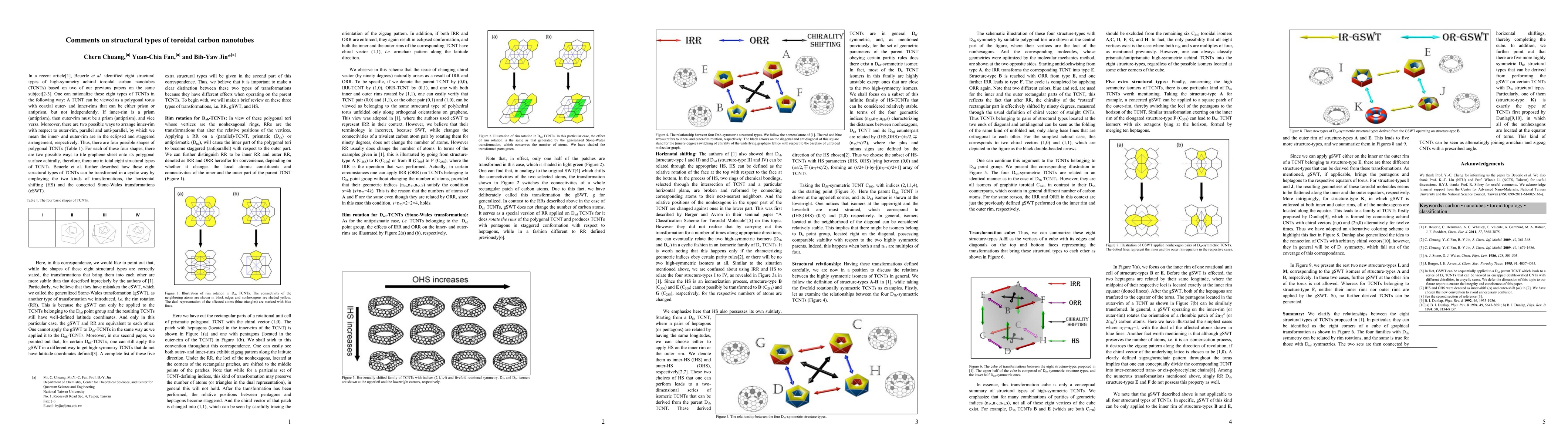 This paper elucidates the structural relationships among the eight types of toroidal carbon nanotubes (TCNTs), showing how they form the corners of a transformation cube. It identifies connections through rim rotations and horizontal shiftings, and highlights five additional highly symmetric Dnh types derived from generalized Stone-Wales transformations.