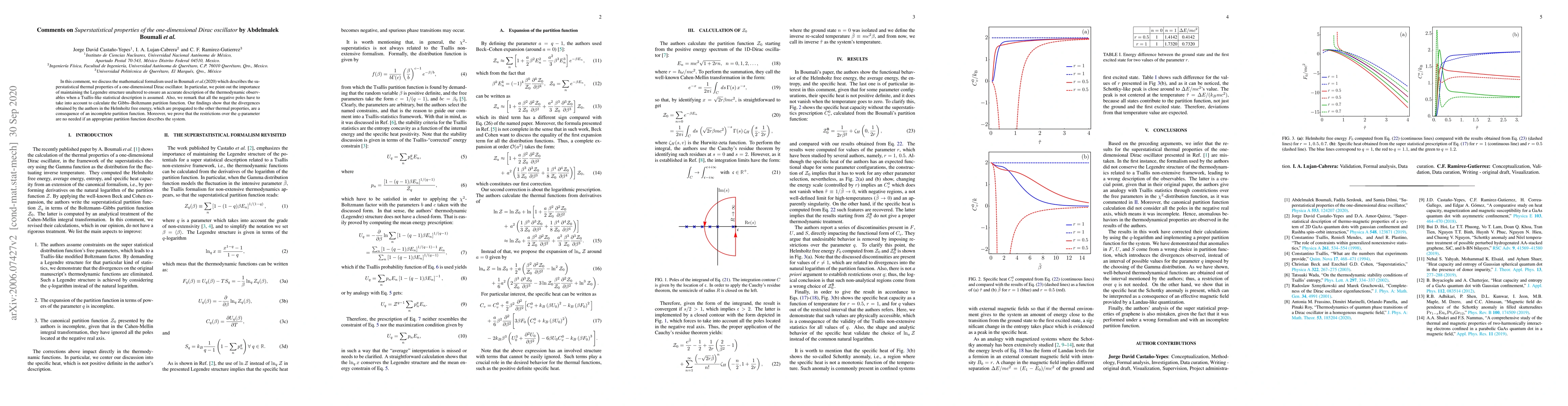 In this comment, we discuss the mathematical formalism used in Boumali et al. (2020) which describes the superstatistical thermal properties of a one-dimensional Dirac oscillator. In particular, we point out the importance of maintaining the Legendre structure unaltered to ensure an accurate description of the thermodynamic observables when a Tsallis-like statistical description is assumed. Also, we remark that all the negative poles have to take into account to calculate the Gibbs--Boltzmann partition function. Our findings show that the divergences obtained by the authors in the Helmholtz free energy, which are propagated to the other thermal properties, are a consequence of an incomplete partition function. Moreover, we prove that the restrictions over the $q$-parameter are no needed if an appropriate partition function describes the system.