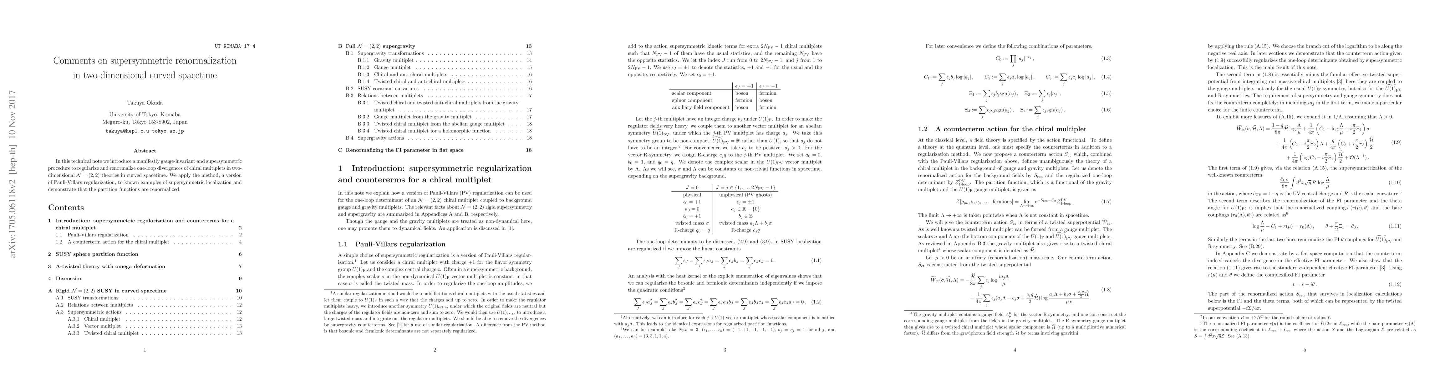 In this technical note we introduce a manifestly gauge-invariant and supersymmetric procedure to regularize and renormalize one-loop divergences of chiral multiplets in two-dimensional N=(2,2) theories in curved spacetime. We apply the method, a version of Pauli-Villars regularization, to known examples of supersymmetric localization and demonstrate that the partition functions are renormalized. An accompanying ancillary file, a Mathematica notebook, implements the relevant supergravity transformations.