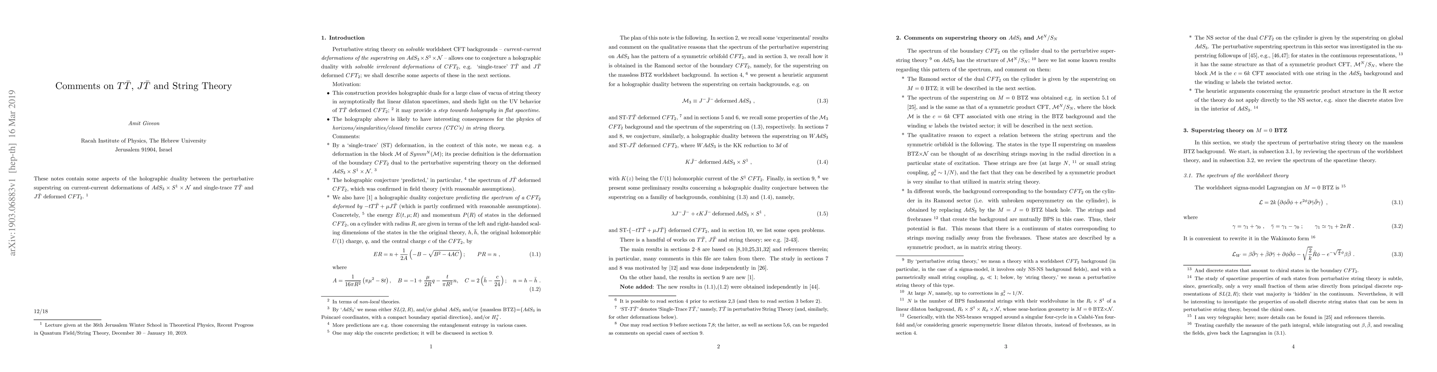 These notes contain some aspects of the holographic duality between the perturbative superstring on current-current deformations of $AdS_3\times S^1\times{\cal N}$ and single-trace $T\bar T$ and $J\bar T$ deformed $CFT_2$.