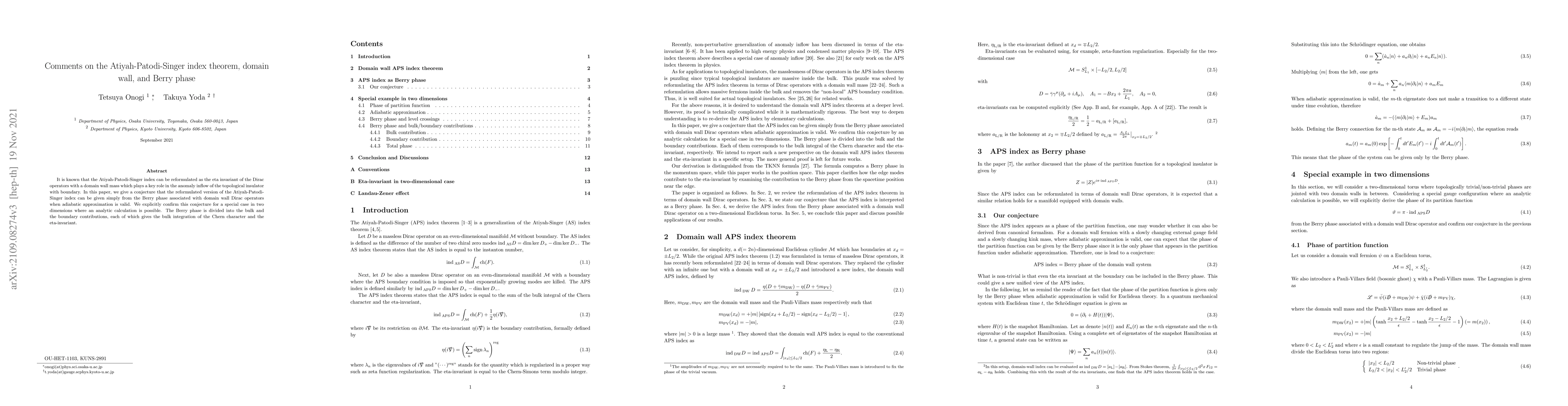 This paper reformulates the Atiyah-Patodi-Singer index theorem in terms of the eta invariant of Dirac operators with a domain wall mass. It conjectures that the reformulated index can be derived from the Berry phase under adiabatic approximation, and confirms this for a two-dimensional case, showing contributions from both bulk and boundary.