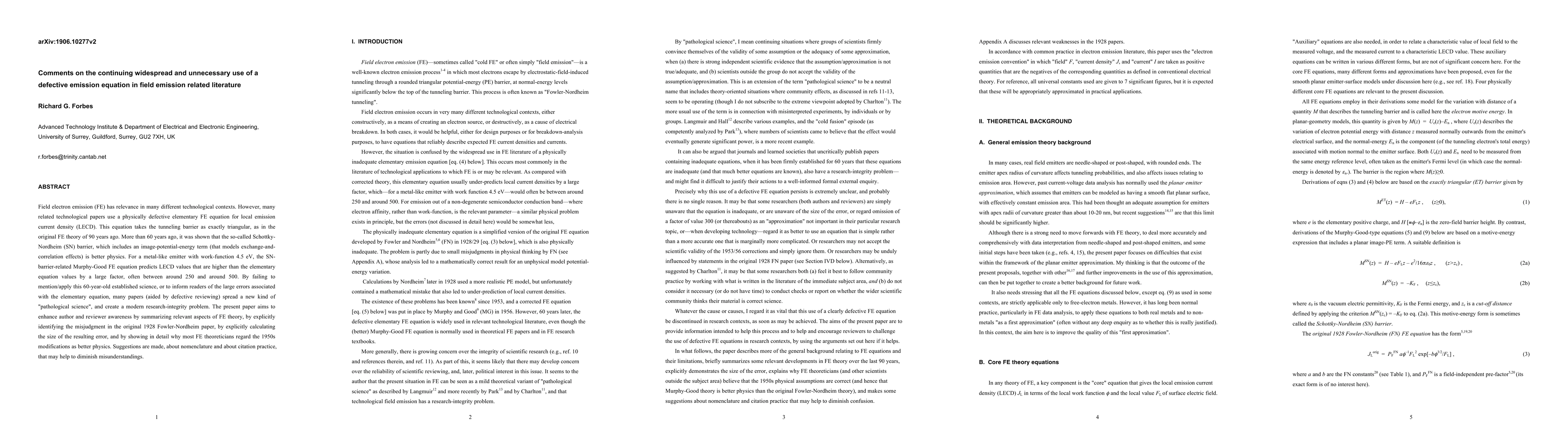 Field electron emission (FE) has relevance in many different technological contexts. However, many related technological papers use a physically defective elementary FE equation for local emission current density (LECD). This equation takes the tunneling barrier as exactly triangular, as in the original FE theory of 90 years ago. More than 60 years ago, it was shown that the so-called Schottky-Nordheim (SN) barrier, which includes an image-potential-energy term (that models exchange-and-correlation effects) is better physics. For a metal-like emitter with work-function 4.5 eV, the SN-barrier-related Murphy-Good FE equation predicts LECD values that are higher than the elementary equation values by a large factor, often between around 250 and around 500. By failing to mention/apply this 60-year-old established science, or to inform readers of the large errors associated with the elementary equation, many papers (aided by defective reviewing) spread a new kind of "pathological science", and create a modern research-integrity problem. The present paper aims to enhance author and reviewer awareness by summarizing relevant aspects of FE theory, by explicitly identifying the misjudgment in the original 1928 Fowler-Nordheim paper, by explicitly calculating the size of the resulting error, and by showing in detail why most FE theoreticians regard the 1950s modifications as better physics. Suggestions are made, about nomenclature and about citation practice, that may help to diminish misunderstandings.