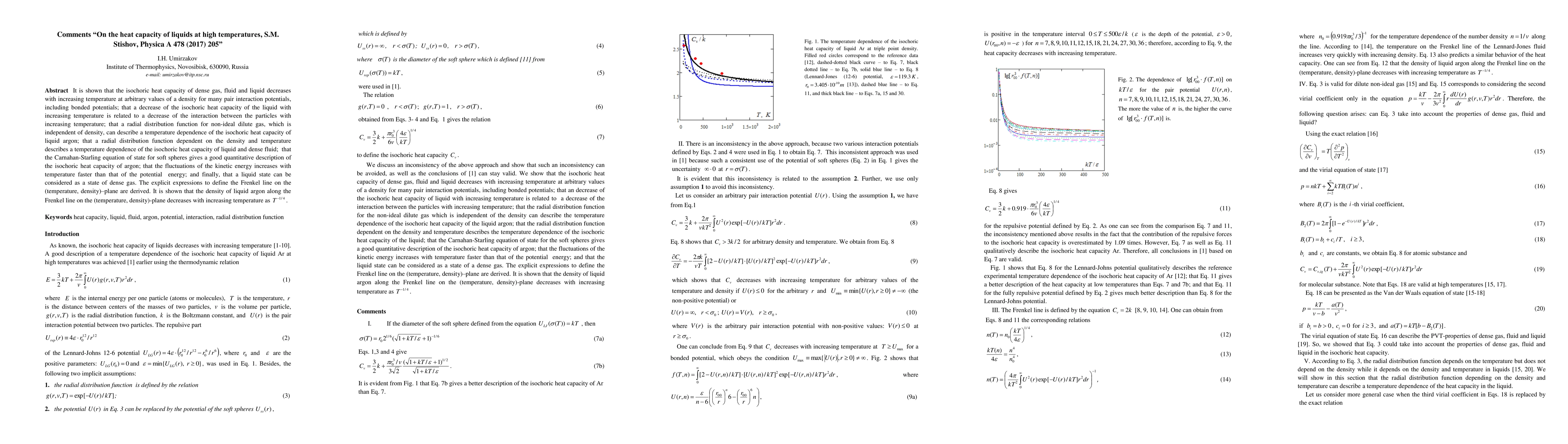 It is shown that the isochoric heat capacity of dense gas, fluid and liquid decreases with increasing temperature at arbitrary values of a density for many pair interaction potentials, including bonded potentials; that a decrease of the isochoric heat capacity of the liquid with increasing temperature is related to a decrease of the interaction between the particles with increasing temperature; that a radial distribution function for nonideal dilute gas, which is independent of density, can describe a temperature dependence of the isochoric heat capacity of liquid argon; that a radial distribution function dependent on the density and temperature describes a temperature dependence of the isochoric heat capacity of liquid and dense fluid; that the Carnahan-Starling equation of state for soft spheres gives a good quantitative description of the isochoric heat capacity of argon; that the fluctuations of the kinetic energy increases with temperature faster than that of the potential energy; and finally, that a liquid state can be considered as a state of dense gas. The explicit expressions to define the Frenkel line on the (temperature, density) plane are derived.