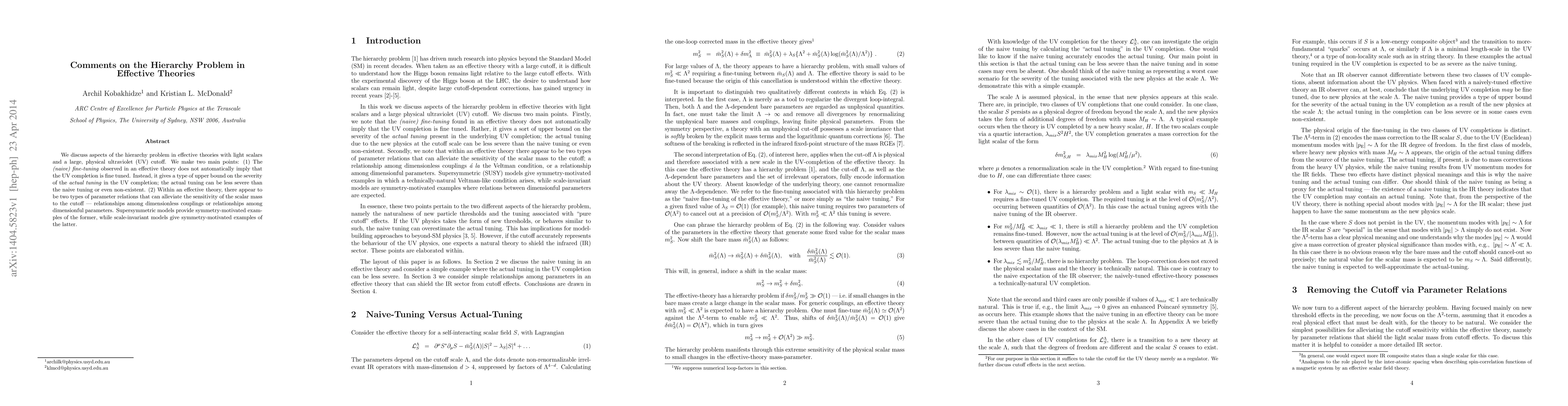 We discuss aspects of the hierarchy problem in effective theories with light scalars and a large, physical ultraviolet (UV) cutoff. We make two main points: (1) The (naive) fine-tuning observed in an effective theory does not automatically imply that the UV completion is fine tuned. Instead, it gives a type of upper bound on the severity of the actual tuning in the UV completion; the actual tuning can be less severe than the naive tuning or even non-existent. (2) Within an effective theory, there appear to be two types of parameter relations that can alleviate the sensitivity of the scalar mass to the cutoff --- relationships among dimensionless couplings or relationships among dimensionful parameters. Supersymmetric models provide symmetry-motivated examples of the former, while scale-invariant models give symmetry-motivated examples of the latter.
