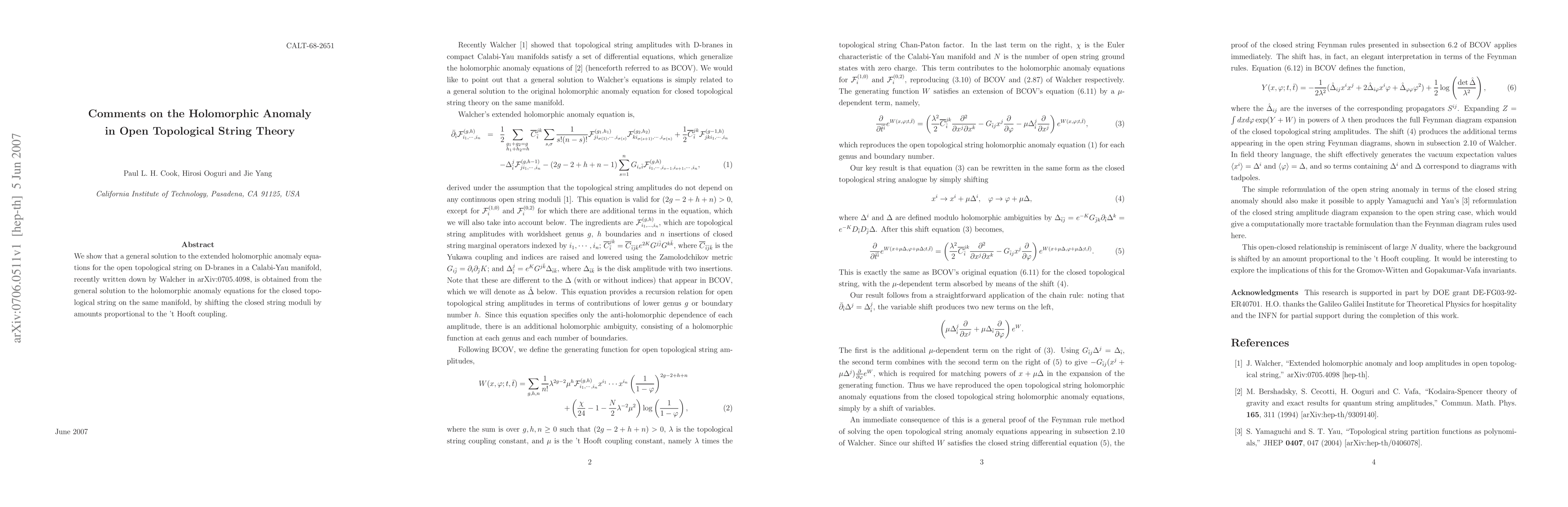We show that a general solution to the extended holomorphic anomaly equations for the open topological string on D-branes in a Calabi-Yau manifold, recently written down by Walcher in arXiv:0705.4098, is obtained from the general solution to the holomorphic anomaly equations for the closed topological string on the same manifold, by shifting the closed string moduli by amounts proportional to the 't Hooft coupling.