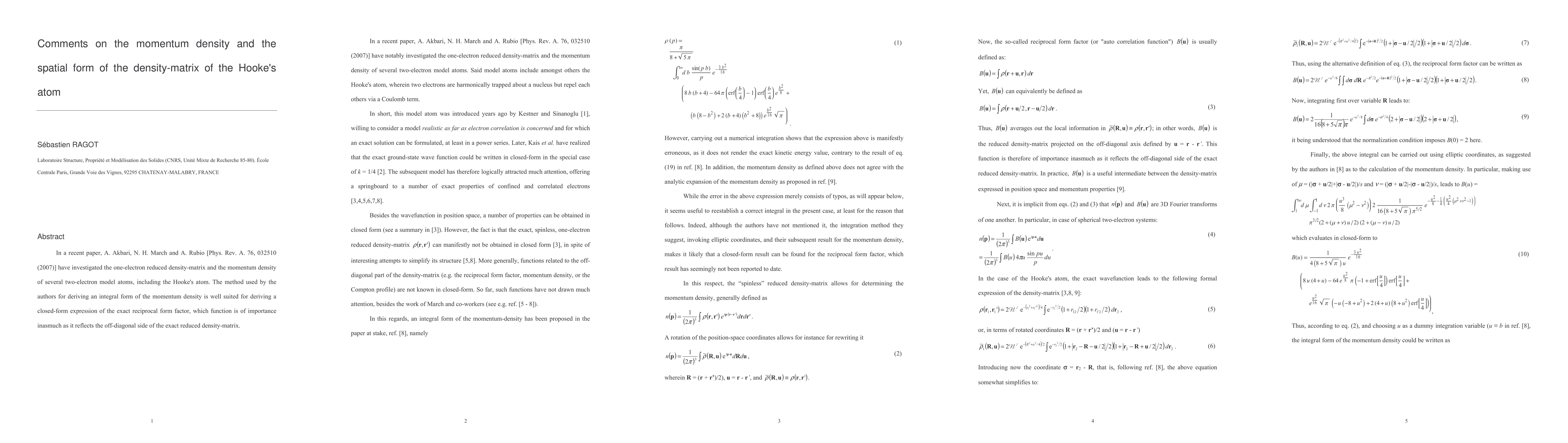 In a recent paper, A. Akbari, N. H. March and A. Rubio [Phys. Rev. A. 76, 032510 (2007)] have investigated the one-electron reduced density-matrix and the momentum density of several two-electron model atoms, including the Hooke's atom. The method used by the authors for deriving an integral form of the momentum density is well suited for deriving a closed-form expression of the exact reciprocal form factor, which function is of importance inasmuch as it reflects the off-diagonal side of the exact reduced density-matrix.