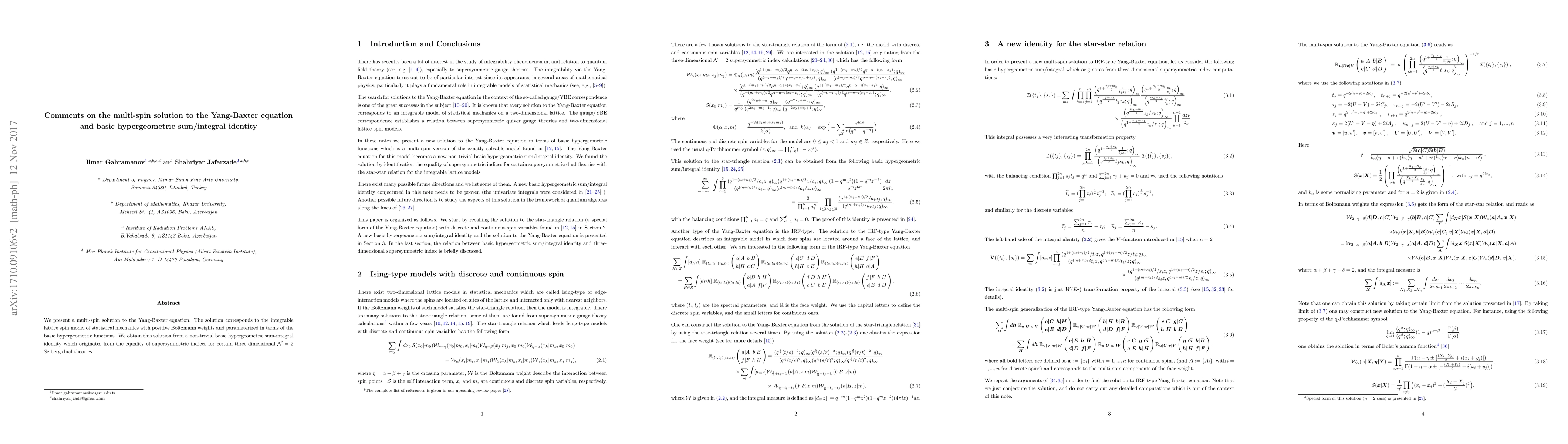 We present a multi-spin solution to the Yang-Baxter equation. The solution corresponds to the integrable lattice spin model of statistical mechanics with positive Boltzmann weights and parameterized in terms of the basic hypergeometric functions. We obtain this solution from a non-trivial basic hypergeometric sum-integral identity which originates from the equality of supersymmetric indices for certain three-dimensional N=2 Seiberg dual theories.