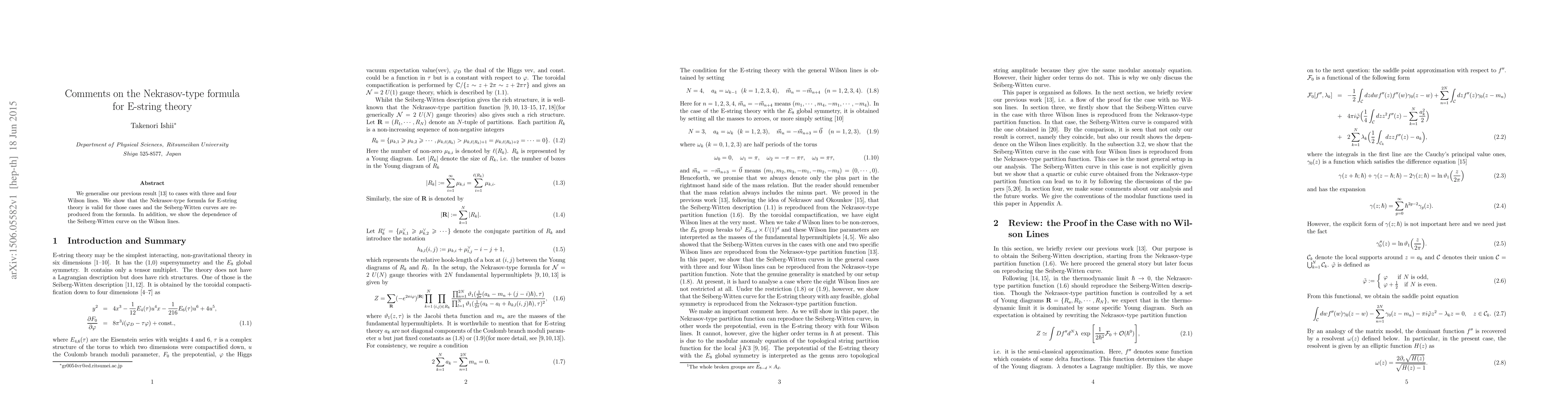 This paper generalises the Nekrasov-type formula for E-string theory to include three and four Wilson lines, demonstrating its validity and showing that it reproduces the Seiberg-Witten curves, with a detailed analysis of the curve's dependence on the Wilson lines.