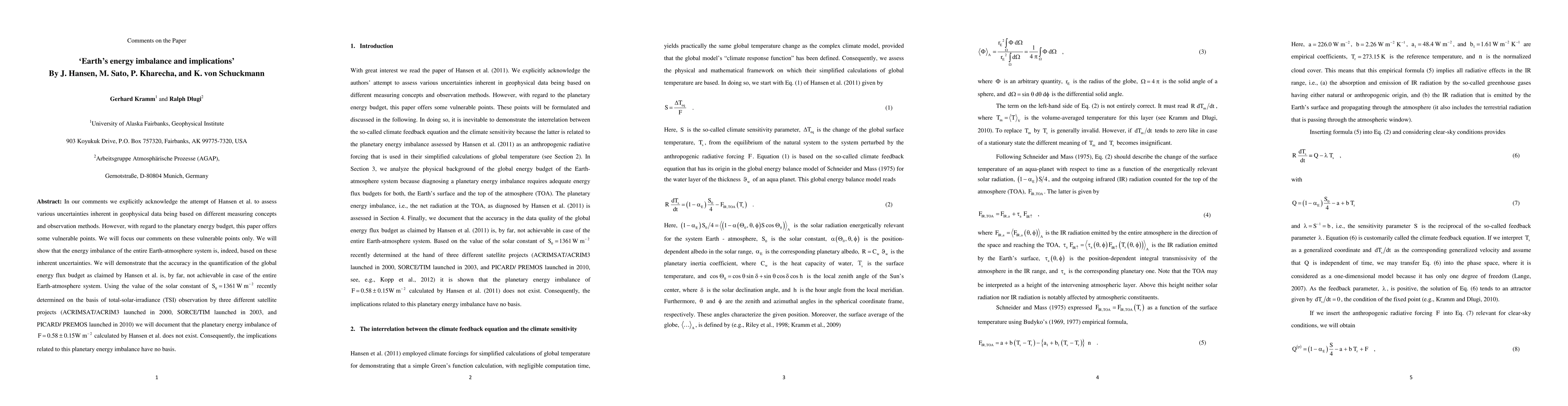 In our comments we explicitly acknowledge the attempt of Hansen et al. to assess various uncertainties inherent in geophysical data being based on different measuring concepts and observation methods. However, with regard to the planetary energy budget, this paper offers some vulnerable points. We will focus our comments on these vulnerable points only. We will show that the energy imbalance of the entire Earth-atmosphere system is, indeed, based on these inherent uncertainties. We will demonstrate that the accuracy in the quantification of the global energy flux budget as claimed by Hansen et al. is, by far, not achievable in case of the entire Earth-atmosphere system. Using the value of the solar constant of S_0 = 1361 W/m^2 recently determined on the basis of total-solar-irradiance (TSI) observation by three different satellite projects (ACRIMSAT/ACRIM3 launched in 2000, SORCE/TIM launched in 2003, and PICARD/PREMOS launched in 2010) we will document that the planetary energy imbalance of F = 0.58 +/- 0.15 W/m^2 calculated by Hansen et al. does not exist. Consequently, the implications related to this planetary energy imbalance have no basis.