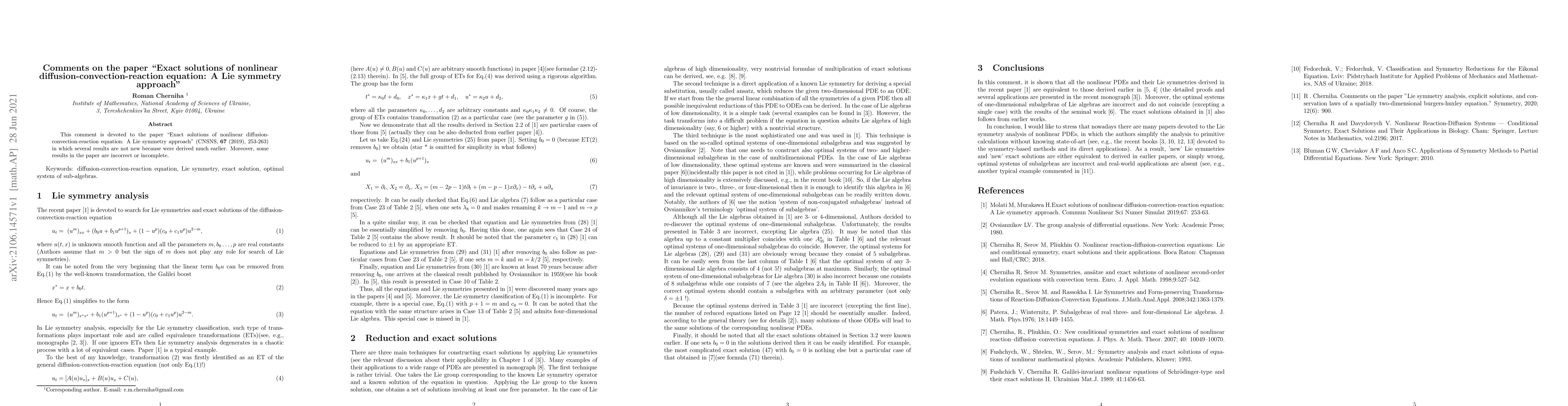 Summary: This comment critiques the paper on exact solutions of the nonlinear diffusion-convection-reaction equation using Lie symmetry approach, asserting that several results are not novel and some are incorrect or incomplete.