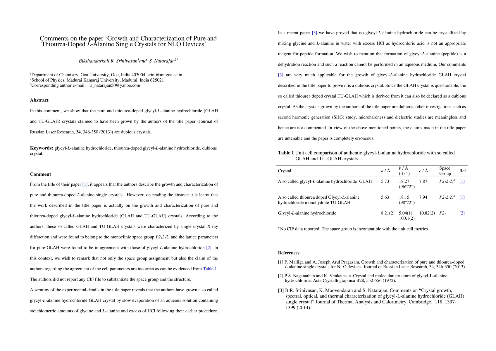 we show that the pure and thiourea-doped glycyl-L-alanine hydrochloride (GLAH and TU-GLAH) crystals claimed to have been grown by the authors of the title paper (Journal of Russian Laser Research, 34, 346-350 (2013)) are dubious crystals.