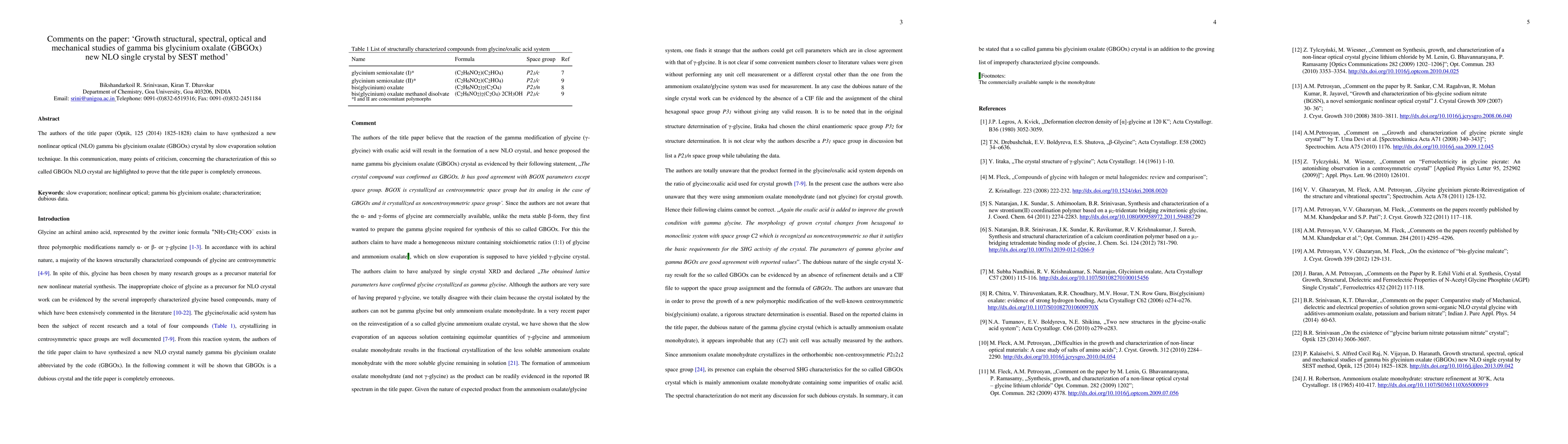 Summary: This paper critiques the characterization of a newly synthesized gamma bis glycinium oxalate (GBGOx) nonlinear optical crystal, arguing that the original study contains significant errors and is fundamentally flawed. The critique focuses on the structural, spectral, optical, and mechanical properties of the crystal.