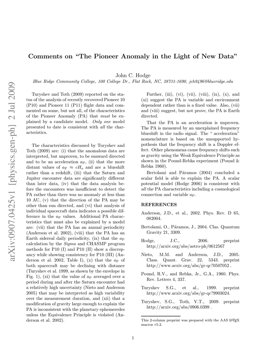 Turyshev, S.G., Toth, V.T., 2009. (preprint arXiv:0906.0399) reported on the status of the analysis of recently recovered Pioneer 10 (P10) and Pioneer 11 (P11) flight data and commented on some, but not all, of the characteristics of the Pioneer Anomaly (PA) that must be explained by a candidate model. Only one model presented to date is consistent with all the characteristics.