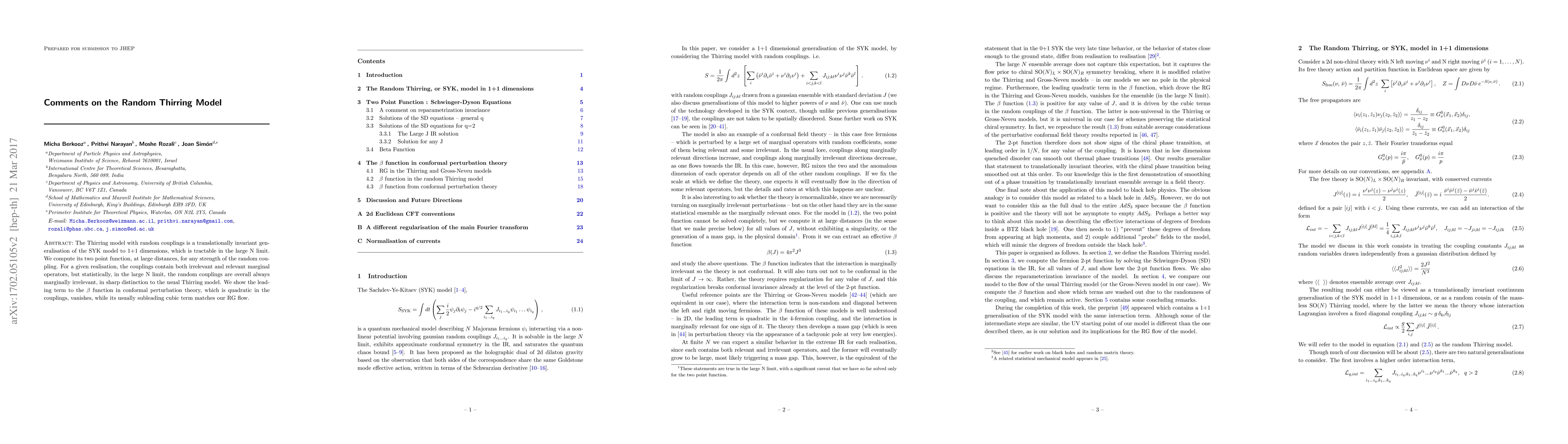 The Thirring model with random couplings is a translationally invariant generalisation of the SYK model to 1+1 dimensions, which is tractable in the large N limit. We compute its two point function, at large distances, for any strength of the random coupling. For a given realisation, the couplings contain both irrelevant and relevant marginal operators, but statistically, in the large N limit, the random couplings are overall always marginally irrelevant, in sharp distinction to the usual Thirring model. We show the leading term to the $\beta$ function in conformal perturbation theory, which is quadratic in the couplings, vanishes, while its usually subleading cubic term matches our RG flow.