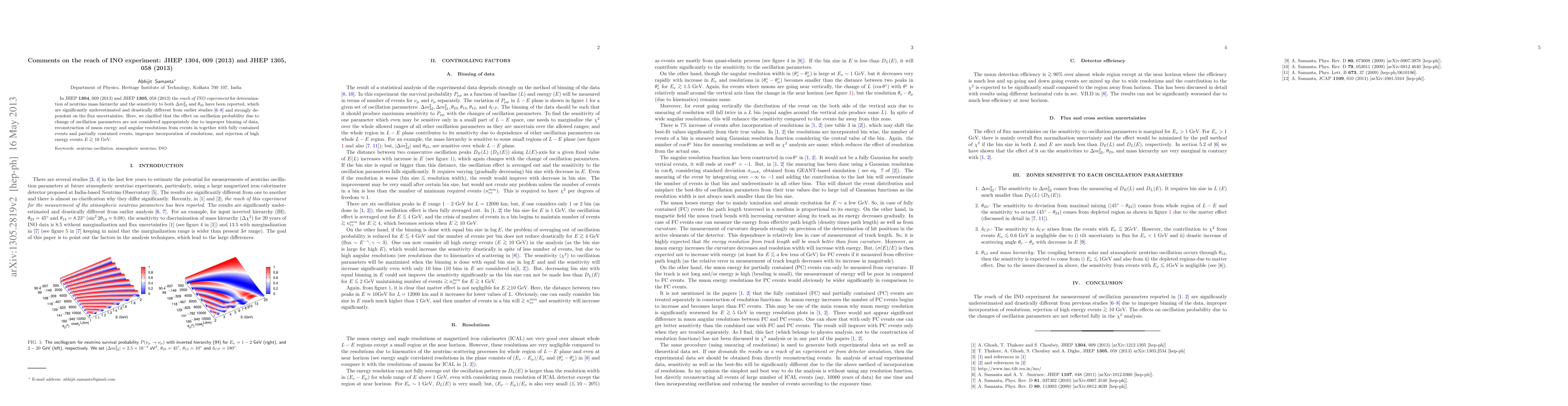 In JHEP {\bf 1304}, 009 (2013) and arXiv:1303.2534 [hep-ph] the {\it reach of INO experiment} for determination of neutrino mass hierarchy and the sensitivity to both $\Delta m_{32}^2$ and $\theta_{23}$ have been reported, which are significantly underestimated and drastically different from earlier studies JHEP {\bf 1107}, 048 (2011), Phys. Rev. D {\bf 81}, 037302 (2010) and strongly dependent on the flux uncertainties. Here, we clarified that the effect on oscillation probability due to change of oscillation parameters are not considered appropriately due to improper binning of data, improper incorporation of resolutions, and rejection of high energy events $E\gapp $ 10 GeV.