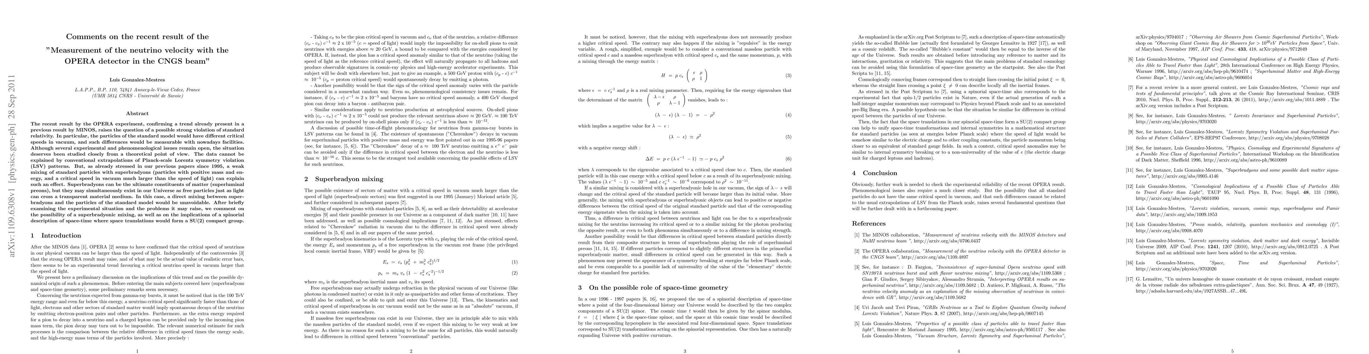 The recent result by the OPERA experiment, confirming a trend already present in a previous result by MINOS, raises the question of a possible strong violation of standard relativity. In particular, the particles of the standard model would have different critical speeds in vacuum, and such differences would be measurable with nowadays facilities. Although several experimental and phenomenological issues remain open, the situation deserves been studied closely from a theoretical point of view. The data cannot be explained by conventional extrapolations of Planck-scale Lorentz symmetry violation (LSV) patterns. But, as already stressed in our previous papers since 1995, a weak mixing of standard particles with superbradyons (particles with positive mass and energy, and a critical speed in vacuum much larger than the speed of light) can explain such an effect. Superbradyons can be the ultimate constituents of matter (superluminal preons), but they may simultaneously exist in our Universe as free particles just as light can cross a transparent material medium. In this case, a direct mixing between superbradyons and the particles of the standard model would be unavoidable. After briefly examining the experimental situation and the problems it may raise, we comment on the possibility of a superbradyonic mixing, as well as on the implications of a spinorial description of space-time where space translations would form a SU(2) compact group.