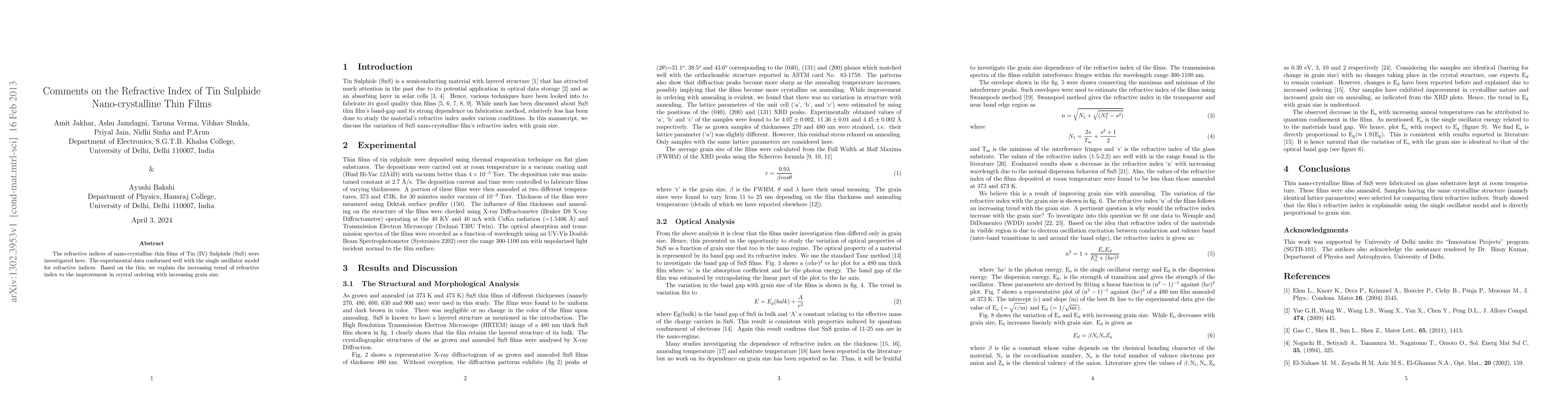 Summary: This study investigates the refractive indices of nano-crystalline thin films of Tin (IV) Sulphide (SnS), finding good agreement with the single oscillator model. The results indicate that the refractive index increases with better crystal ordering and larger grain size.