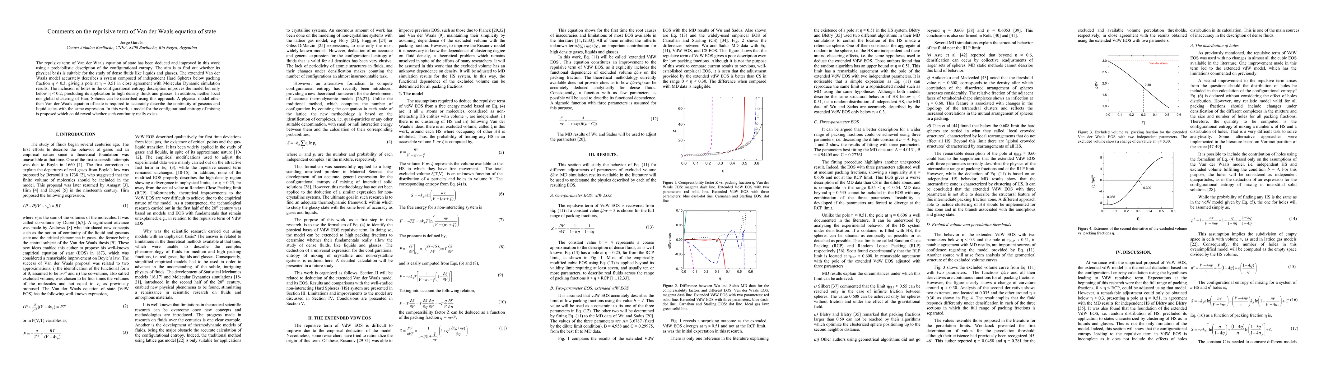 The repulsive term of Van der Waals equation of state has been deduced and improved in this work using a probabilistic description of the configurational entropy. The aim is to find out whether its physical basis is suitable for the study of dense fluids like liquids and glasses. The extended Van der Waals model accurately describes a system composed of independent Hard Spheres below packing fraction {\eta} < 0.3, giving a pole at {\eta} ~ 0.51 in close agreement with Molecular Dynamic simulation results. The inclusion of holes in the configurational entropy description improves the model but only below {\eta} < 0.2, precluding its application to high density fluids and glasses. In addition, neither local nor global clustering of Hard Spheres can be described using this approach. A physical model other than Van der Waals equation of state is required to accurately describe the continuity of gaseous and liquid states with the same expression. In this work, a model for the configurational entropy of mixing is proposed which could reveal whether such continuity really exists.