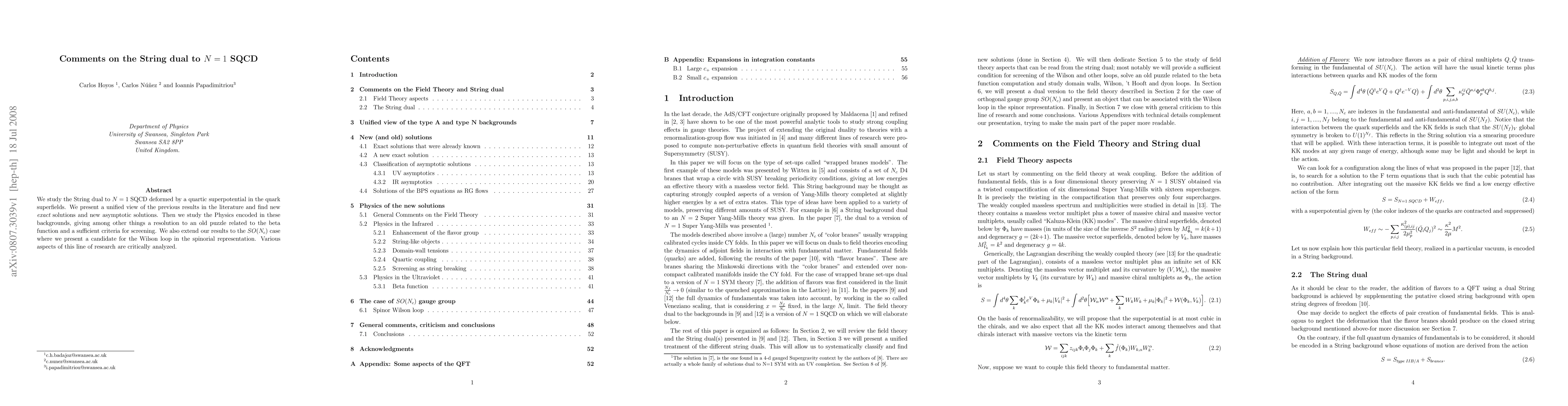 This paper explores the string dual of N=1 SQCD with a quartic superpotential deformation, presenting new exact and asymptotic solutions, resolving an old beta function puzzle, and extending findings to the SO(Nc) case with a candidate for the Wilson loop in the spinorial representation. The study critically analyzes various aspects of the string dual framework.