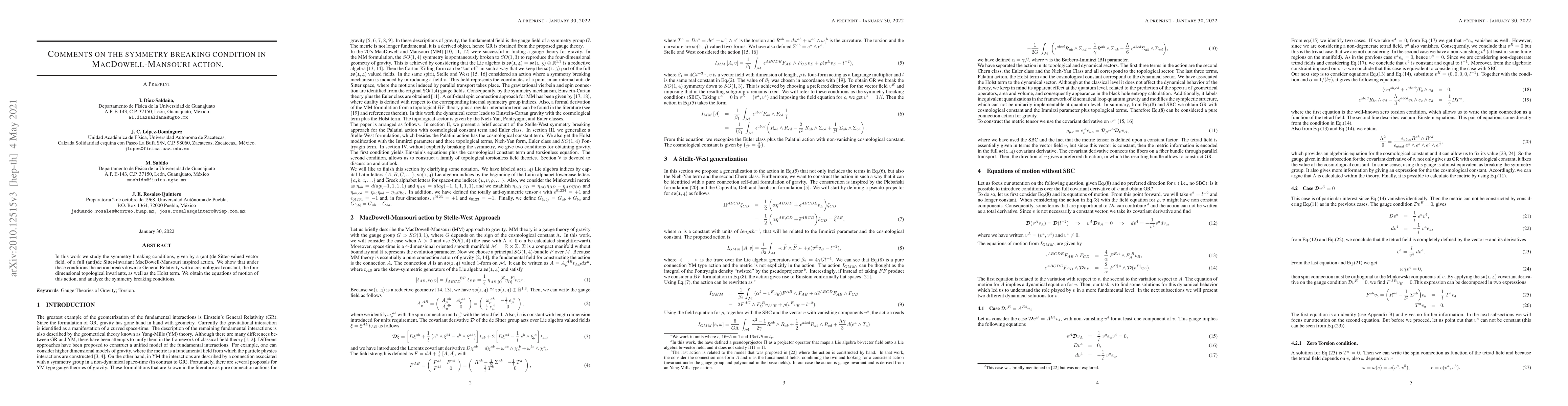 Researchers investigate symmetry breaking conditions in a modified gravity action inspired by MacDowell-Mansouri theory, revealing it reduces to General Relativity with a cosmological constant.