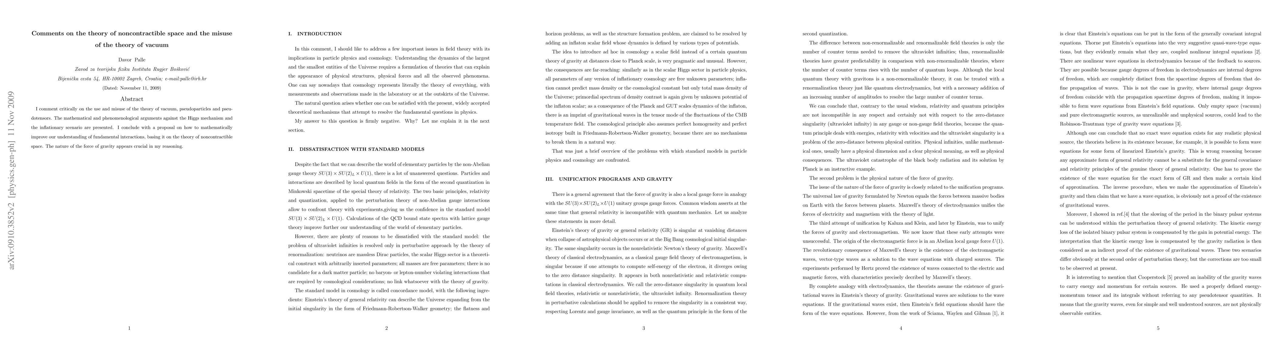 I comment critically on the use and misuse of the theory of vacuum, pseudoparticles and pseudotensors. The mathematical and phenomenological arguments against the Higgs mechanism and the inflationary scenario are presented. I conclude with a proposal on how to mathematically improve our understanding of fundamental interactions, basing it on the theory of noncontractible space. The nature of the force of gravity appears crucial in my reasoning.