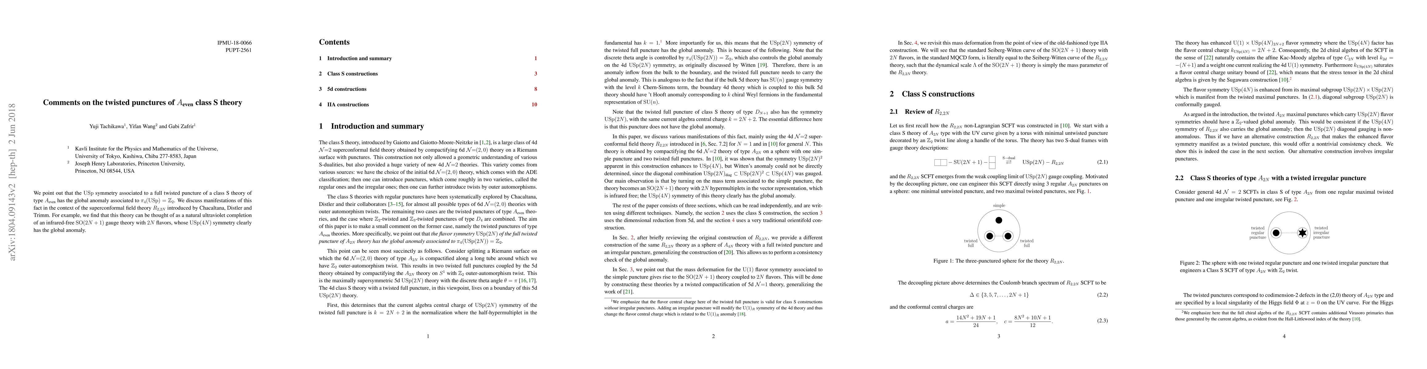 A research paper explores anomalies in twisted punctures of class S theories of type $A_ ext{even}$ and their implications for superconformal field theory $R_{2,2N}$. The study reveals that these theories exhibit global anomaly associated with $ ext{USp}(4N)$ symmetry.
