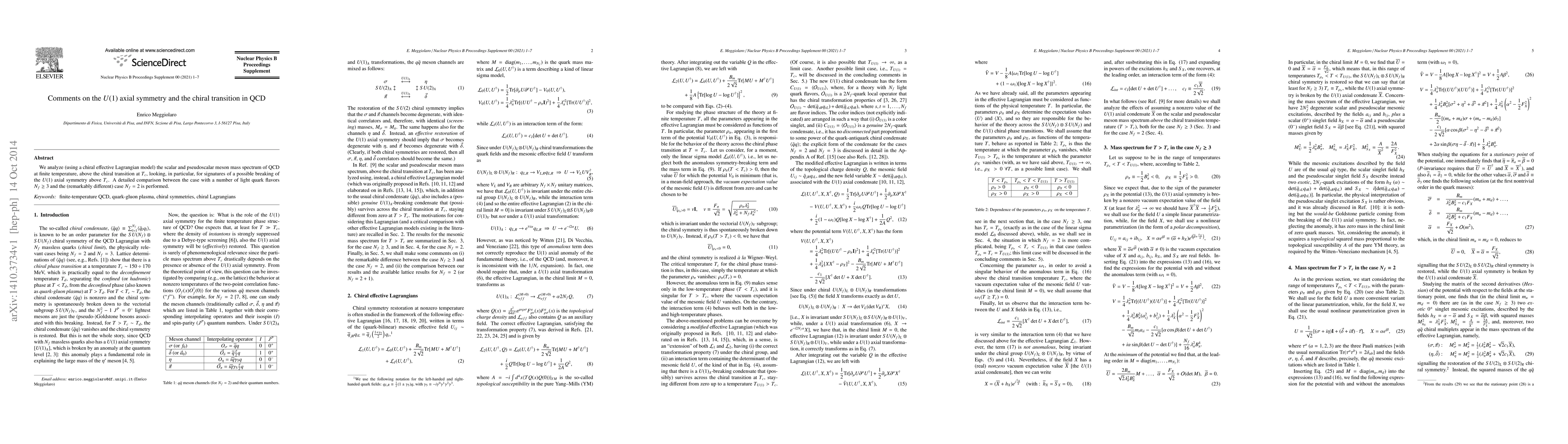 This paper investigates the $U(1)$ axial symmetry and the chiral transition in QCD using a chiral effective Lagrangian model, focusing on the mass spectrum of scalar and pseudoscalar mesons at temperatures above $T_c$ to detect potential symmetry breaking. It contrasts results for $N_f \geq 3$ light quark flavors with those for $N_f=2$.