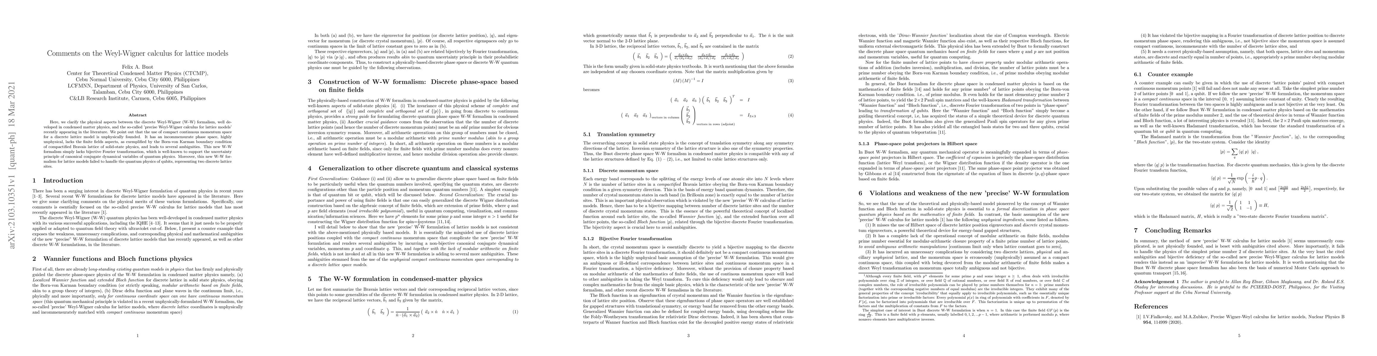 Here, we clarify the physical aspects between the discrete Weyl-Wigner (W-W) formalism, well developed in condensed matter physics, and the so-called 'precise Weyl-Wigner calculus for lattice models' recently appearing in the literature. We point out that the use of compact continuous momentum space for a discrete lattice model is unphysically founded. It has an incommensurate phase space, highly unphysical, lacks the finite fields aspects, as exemplified by the Born-von Karman boundary condition of compactified Bravais lattice of solid-state physics, and leads to several ambiguities. This new W-W formalism simply lacks bijective Fourier transformation, which is well-known to support the uncertainty principle of canonical conjugate dynamical variables of quantum physics. Moreover, this new W-W formalism for lattice models failed to handle the quantum physics of qubits, representing two discrete lattice sites.
