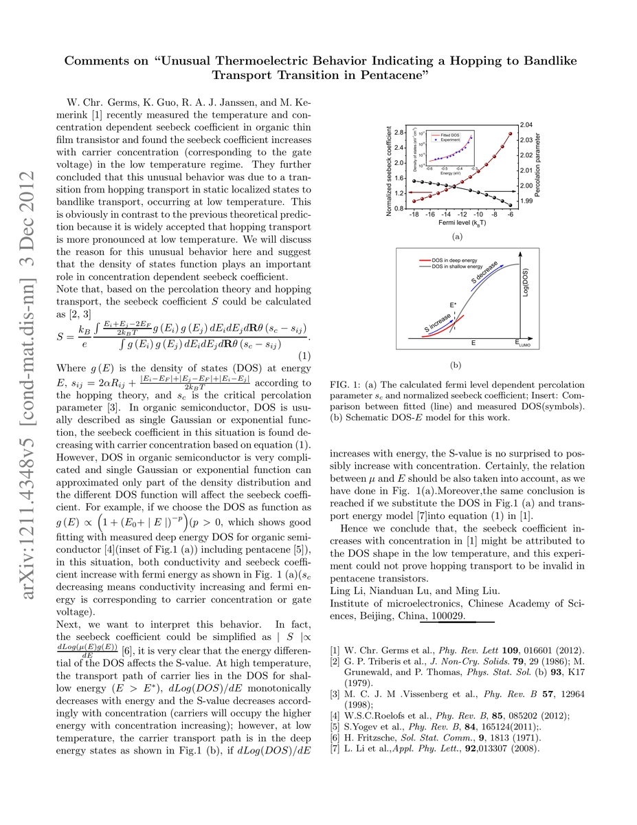 This paper discusses the unusual thermoelectric behavior in pentacene thin film transistors, where the seebeck coefficient increases with carrier concentration at low temperatures, contrary to the expected dominance of hopping transport. The authors propose that the density of states function significantly influences this behavior, suggesting a transition from hopping to bandlike transport.