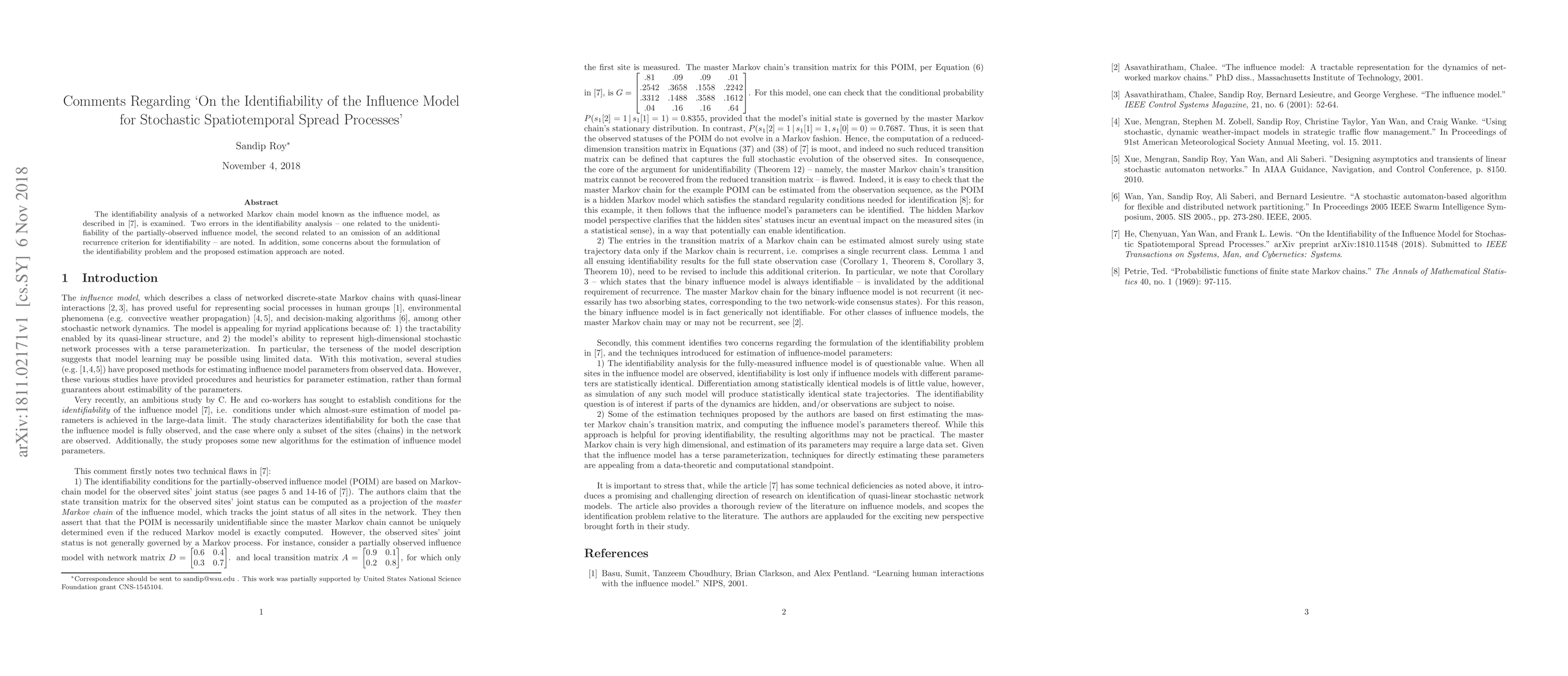 The identifiability analysis of a networked Markov chain model known as the influence model, as described in a recent contribution to Arxiv, is examined. Two errors in the identifiability analysis -- one related to the unidentifiability of the partially-observed influence model, the second related to an omission of an additional recurrence criterion for identifiability -- are noted. In addition, some concerns about the formulation of the identifiability problem and the proposed estimation approach are noted.