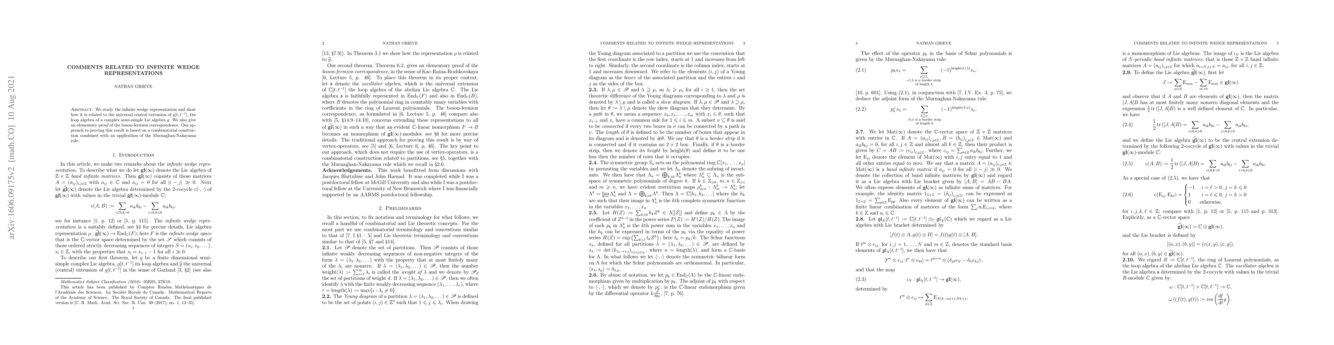 We study the infinite wedge representation and show how it is related to the universal extension of $g[t,t^{-1}]$ the loop algebra of a complex semi-simple Lie algebra $g$. We also give an elementary proof of the boson-fermion correspondence. Our approach to proving this result is based on a combinatorial construction with partitions combined with an application of the Murnaghan-Nakayama rule.