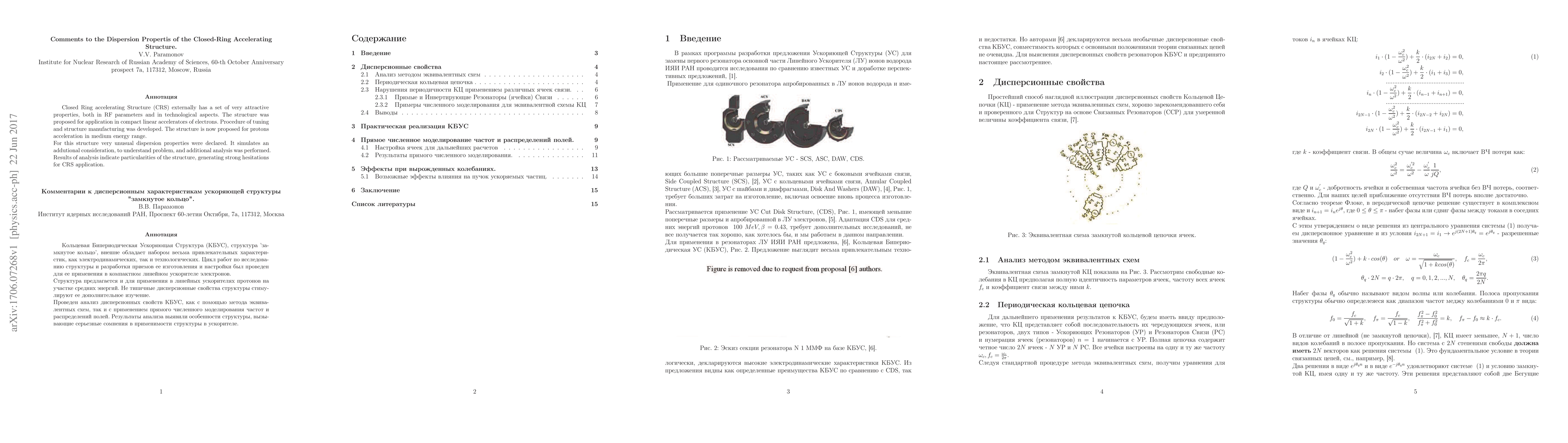 Closed Ring accelerating Structure (CRS) externally has a set of very attractive properties, both in RF parameters and in technological aspects. The structure was proposed for application in compact linear accelerators of electrons. Procedure of tuning and structure manufacturing was developed. The structure is now proposed for protons acceleration in medium energy range.\\ For this structure very unusual dispersion properties were declared. It simulates an additional consideration, to understand problem, and additional analysis was performed.\\ Results of analysis indicate particularities of the structure, generating strong hesitations for CRS.