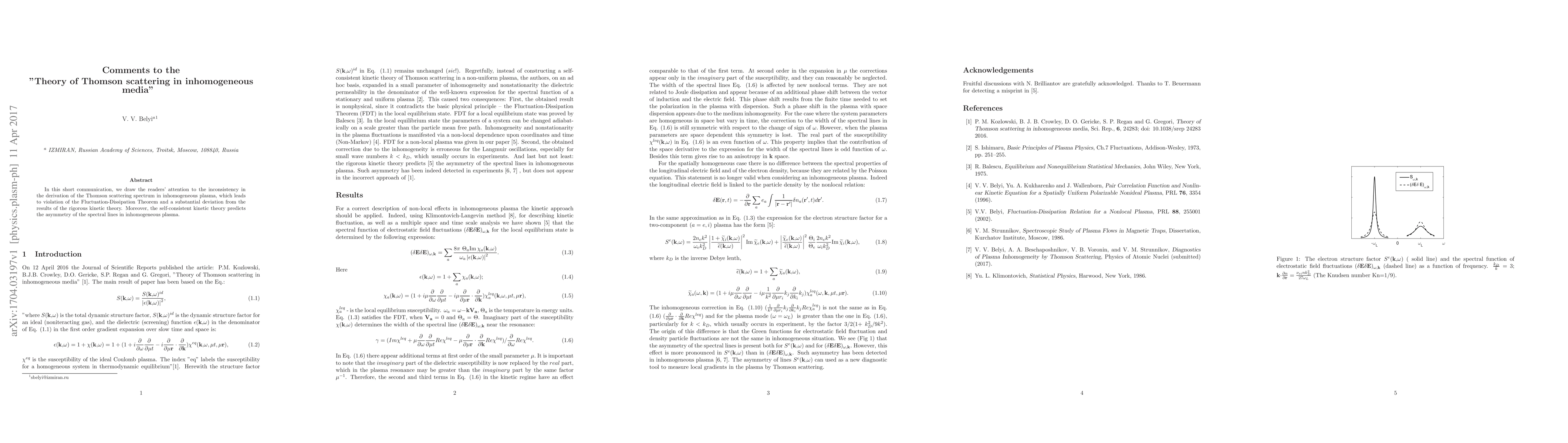 In this short communication, we draw the readers' attention to the inconsistency in the derivation of the Thomson scattering spectrum in inhomogeneous plasma, which leads to violation of the Fluctuation-Dissipation Theorem and a substantial deviation from the results of the rigorous kinetic theory. Moreover, the self-consistent kinetic theory predicts the asymmetry of the spectral lines in inhomogeneous plasma.