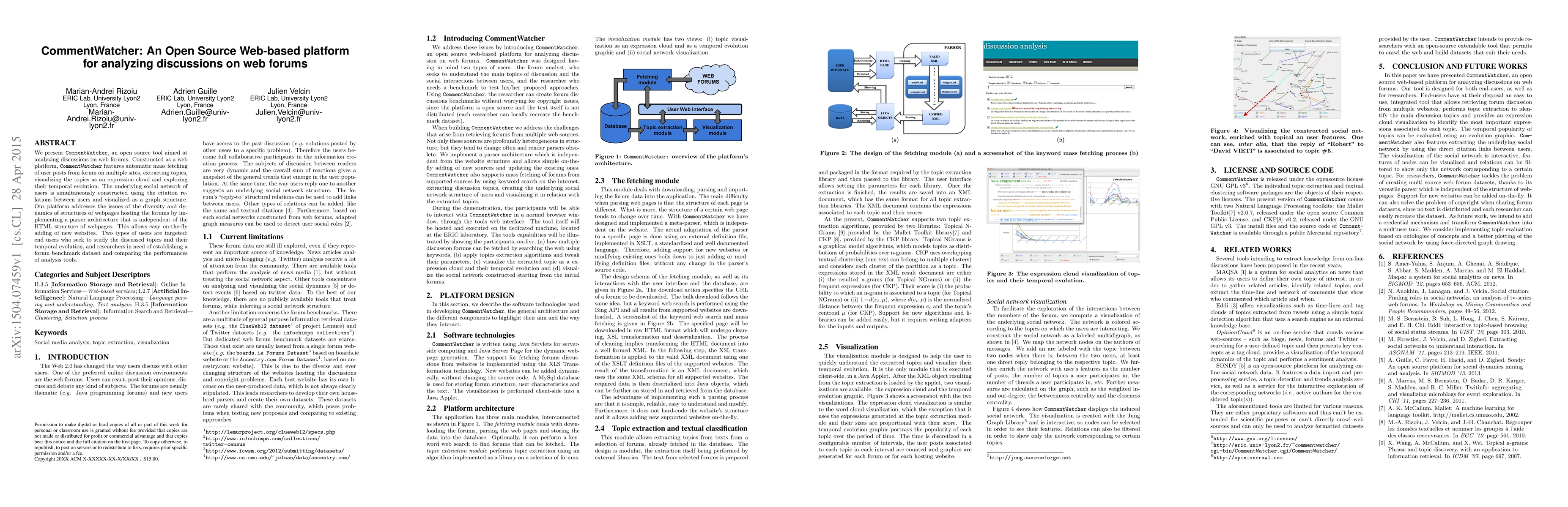 CommentWatcher is an open-source web platform that analyzes discussions on web forums, extracting topics, visualizing their evolution, and creating a social network graph of users. It addresses the dynamic nature of online forums by implementing a parser architecture independent of HTML structure, making it easy to add new websites.