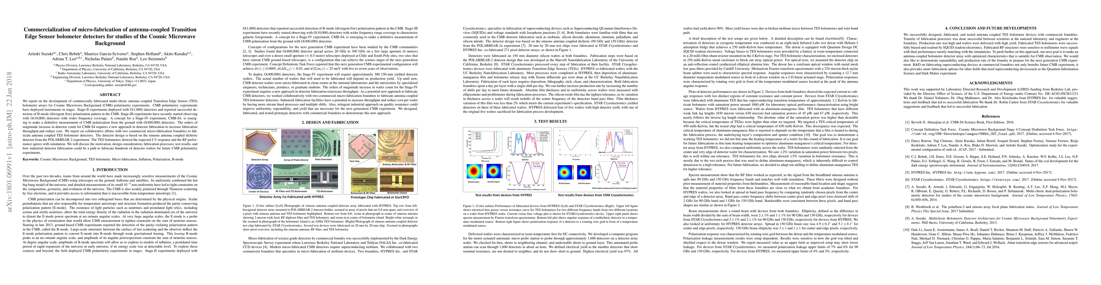 This paper details the commercialization of antenna-coupled Transition Edge Sensor (TES) bolometer detectors for Cosmic Microwave Background (CMB) polarimetry experiments, emphasizing the collaborative efforts with micro-fabrication foundries to meet the increasing demands of future CMB-S4 experiments with significantly higher detector counts. The fabricated detectors show expected performance, suggesting a viable path for large-scale production.