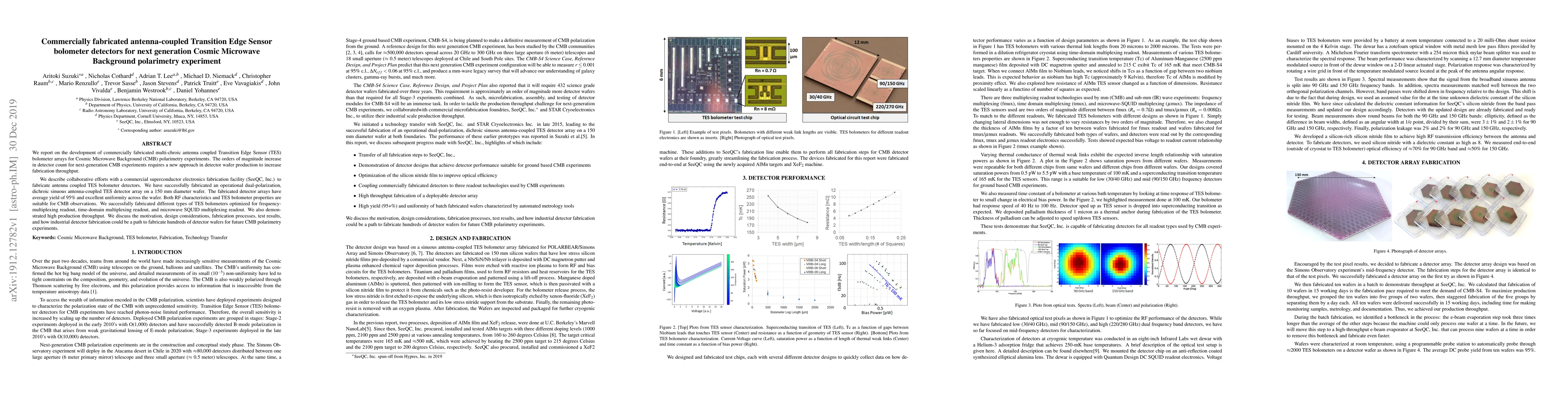 This paper reports on the development of commercially fabricated antenna-coupled Transition Edge Sensor (TES) bolometer arrays for next-generation Cosmic Microwave Background (CMB) polarimetry experiments, utilizing collaborative efforts with a commercial superconductor electronics fabrication facility to achieve high throughput and uniformity. The study highlights successful fabrication and testing of dual-polarization, dichroic TES detectors, optimized for various multiplexing readouts, and discusses the potential for industrial production to meet the demands of future CMB experiments.