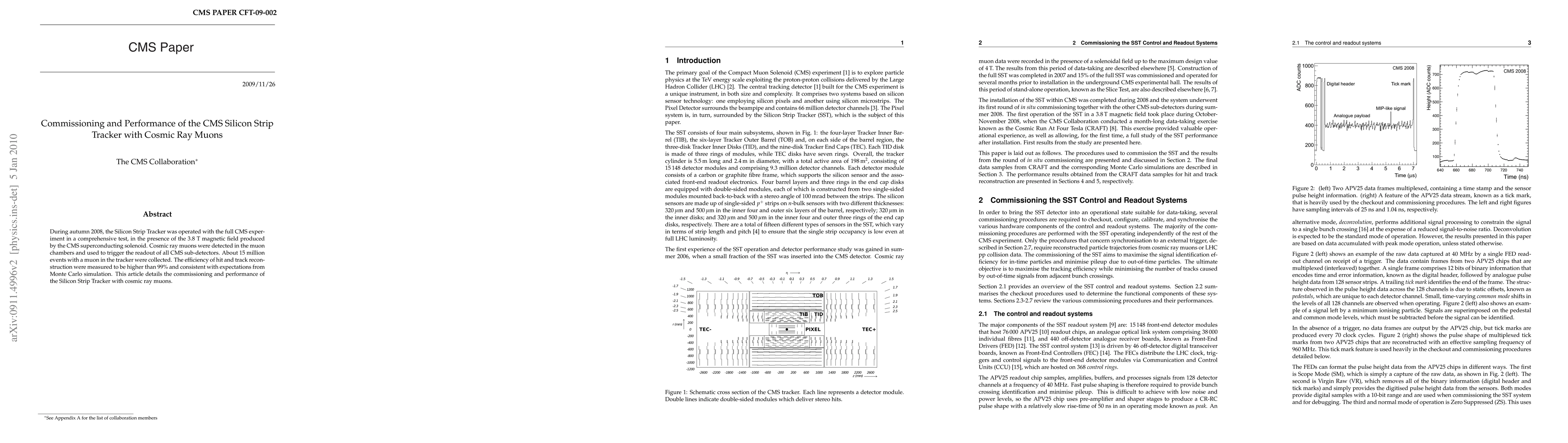 The CMS Silicon Strip Tracker was successfully commissioned in 2008 using cosmic ray muons, achieving an efficiency of over 99% for hit and track reconstruction, consistent with Monte Carlo simulations. This test validated the tracker's performance in the CMS experiment's 3.8 T magnetic field.