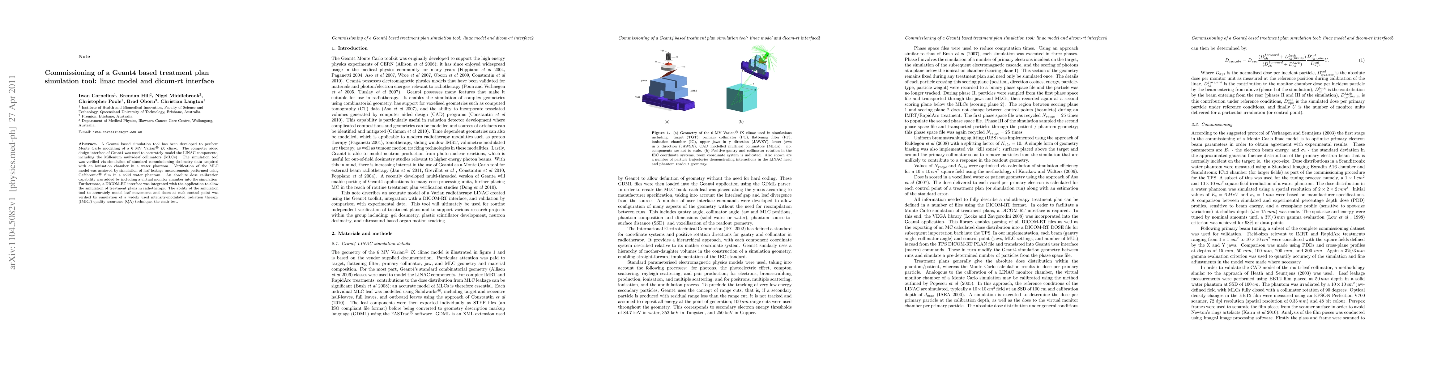 A Geant4-based simulation tool was developed to model a 6 MV VarianTM iX linac and its MLCs, verified through dosimetry and leaf leakage measurements. A DICOM-RT interface was integrated to simulate treatment plans, validated by an IMRT QA technique.