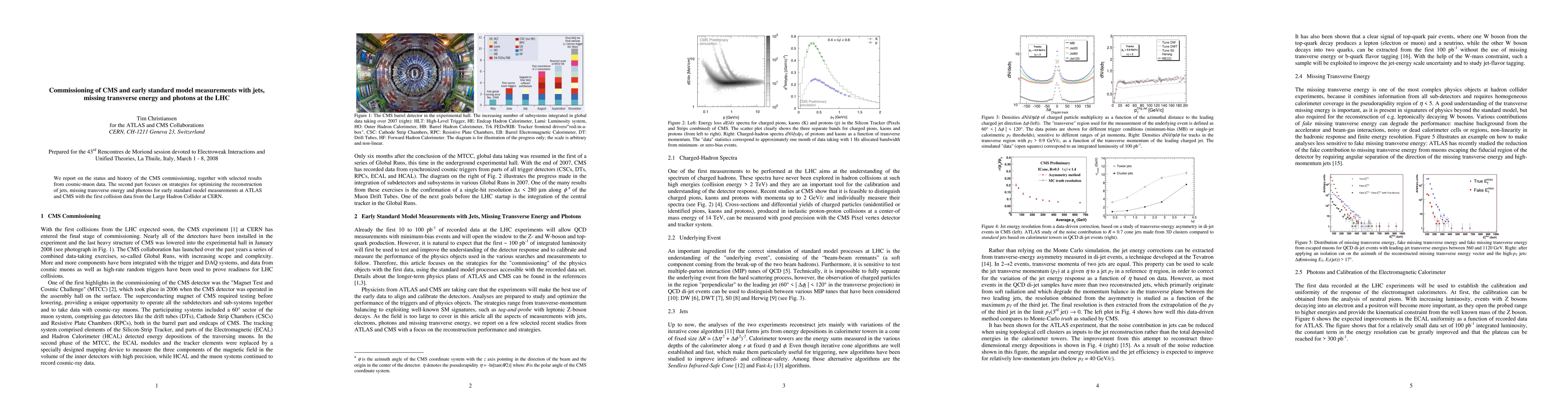 We report on the status and history of the CMS commissioning, together with selected results from cosmic-ray muon data. The second part focuses on strategies for optimizing the reconstruction of jets, missing transverse energy and photons for early standard model measurements at ATLAS and CMS with the first collision data from the Large Hadron Collider at CERN.