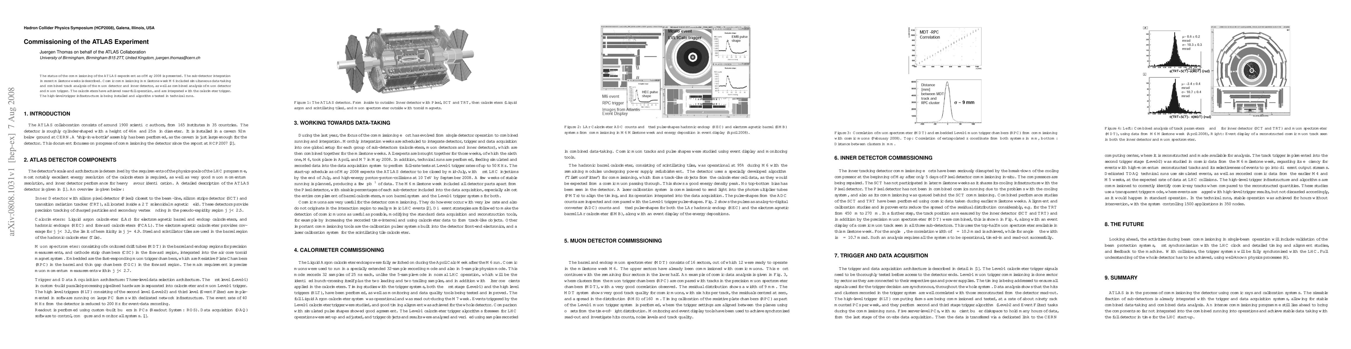 The ATLAS experiment's commissioning status in May 2008 is detailed, highlighting sub-detector integration and cosmic commissioning milestones, including combined track analysis and trigger integration. Calorimeters are nearly fully operational, and the high-level-trigger infrastructure is being installed and tested.