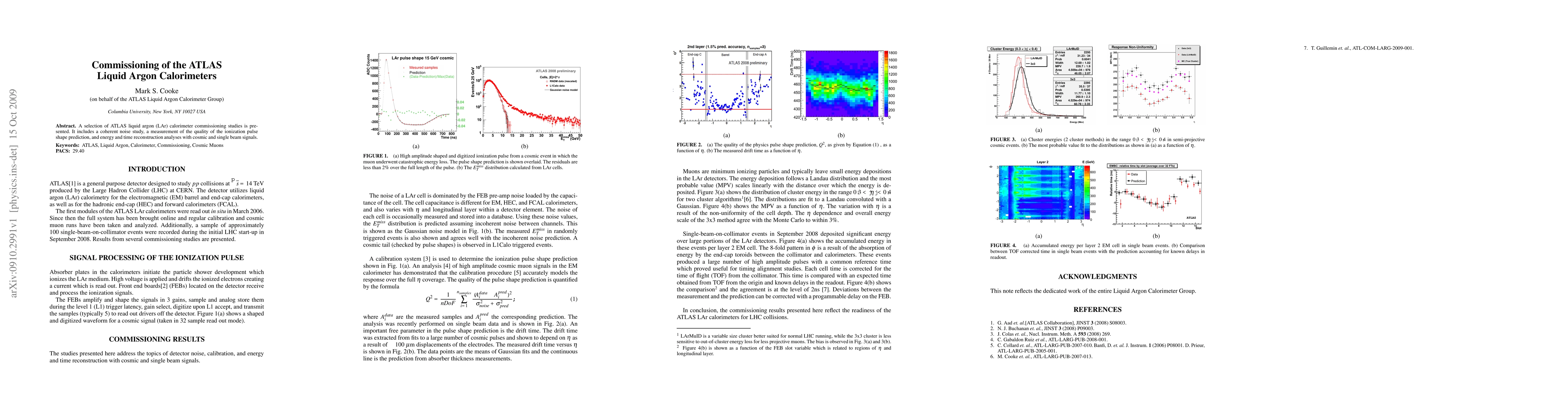 The paper details the commissioning of ATLAS Liquid Argon calorimeters, focusing on noise studies, ionization pulse shape prediction accuracy, and energy and time reconstruction analyses using cosmic and single beam signals. These studies ensure the calorimeter's performance and reliability for particle detection.