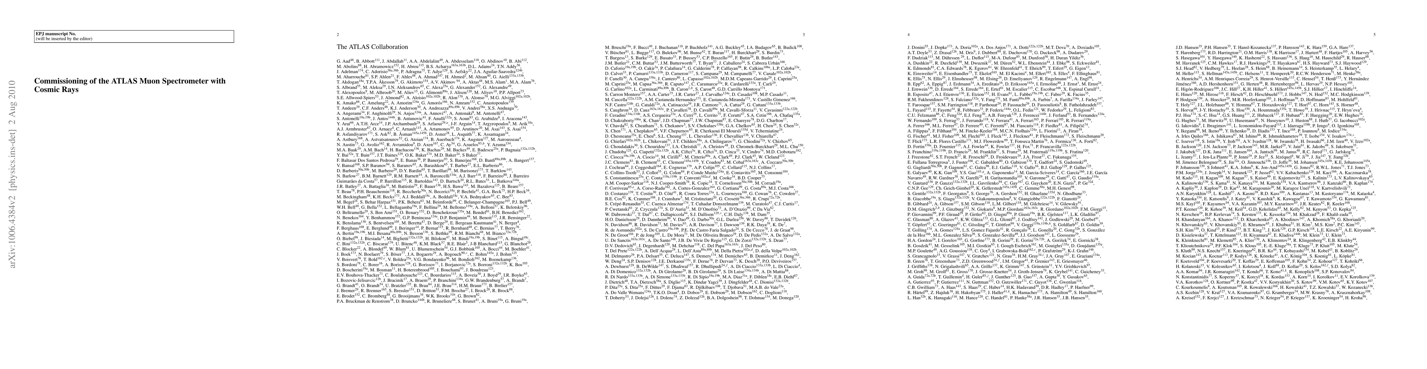 The ATLAS Muon Spectrometer was commissioned using cosmic ray data from 2008 and 2009, demonstrating near-design performance in efficiency, resolution, and alignment, and readiness for high-energy proton-proton collision muon detection. The study confirms the spectrometer's readiness and optimal functioning of all associated systems.