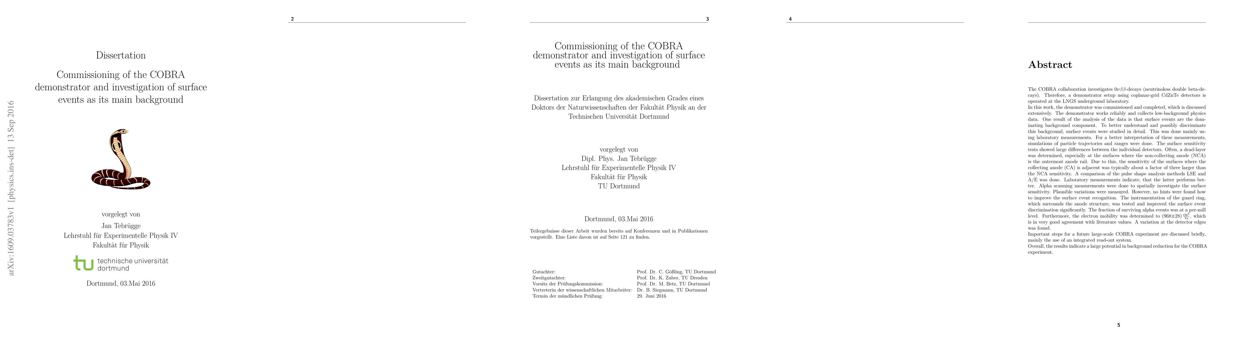 The COBRA demonstrator, utilizing coplanar-grid CdZnTe detectors, was commissioned successfully at LNGS, identifying surface events as the main background. Laboratory measurements and simulations revealed significant differences in detector sensitivity, with the collecting anode surfaces showing three times better performance than non-collecting anode surfaces.