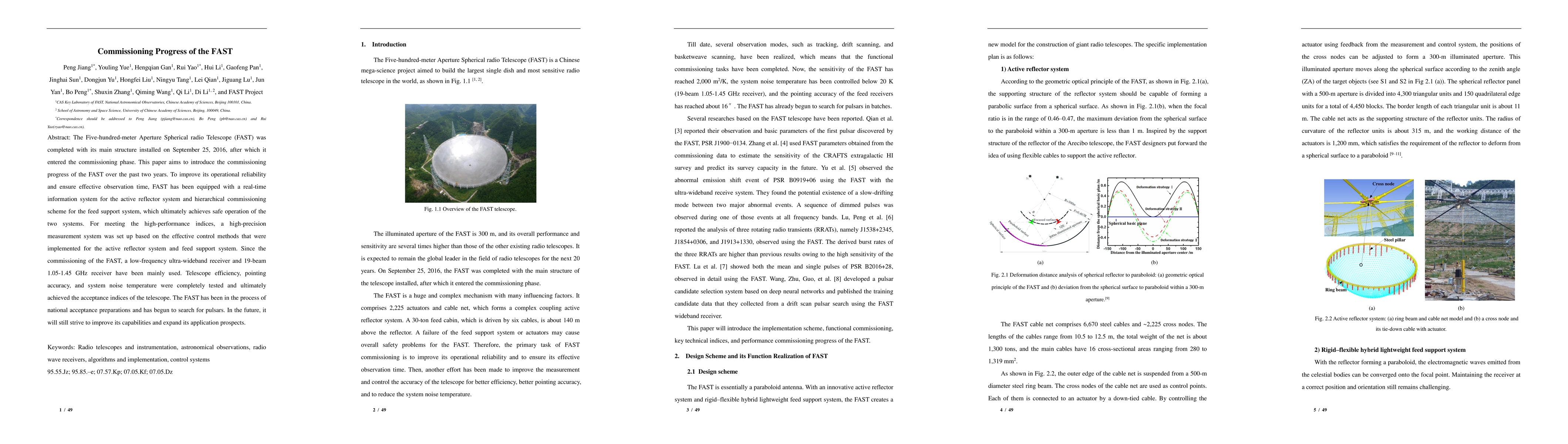 The Five-hundred-meter Aperture Spherical radio Telescope (FAST) was completed with its main structure installed on September 25, 2016, after which it entered the commissioning phase. This paper aims to introduce the commissioning progress of the FAST over the past two years. To improve its operational reliability and ensure effective observation time, FAST has been equipped with a real-time information system for the active reflector system and hierarchical commissioning scheme for the feed support system, which ultimately achieves safe operation of the two systems. For meeting the high-performance indices, a high-precision measurement system was set up based on the effective control methods that were implemented for the active reflector system and feed support system. Since the commissioning of the FAST, a low-frequency ultra-wideband receiver and 19-beam 1.05-1.45 GHz receiver have been mainly used. Telescope efficiency, pointing accuracy, and system noise temperature were completely tested and ultimately achieved the acceptance indices of the telescope. The FAST has been in the process of national acceptance preparations and has begun to search for pulsars. In the future, it will still strive to improve its capabilities and expand its application prospects.