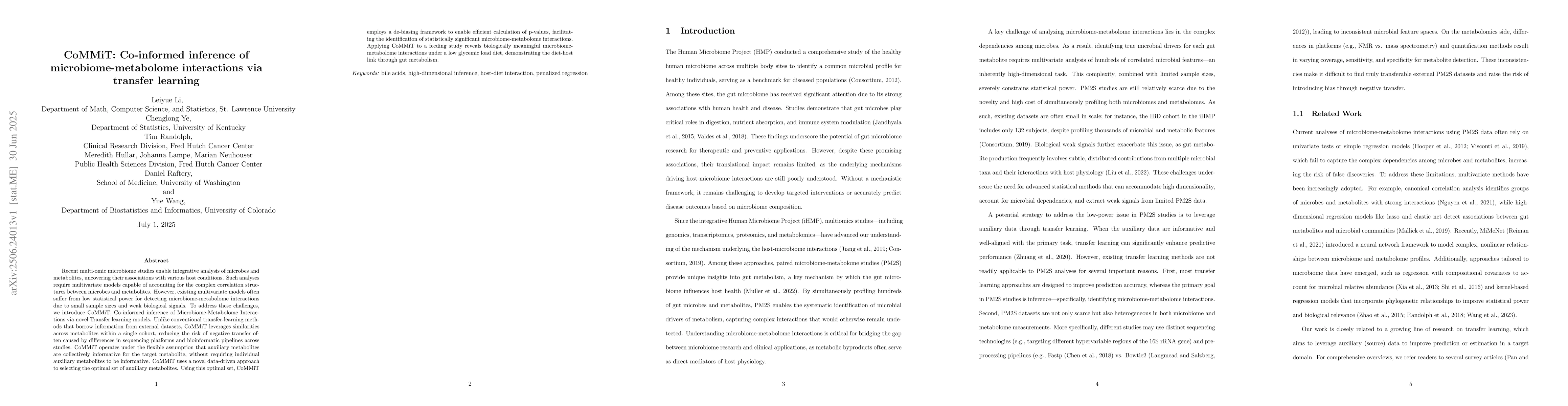 CoMMiT, a novel transfer learning model, improves detection of microbiome-metabolome interactions by leveraging similarities within a single cohort, reducing negative transfer risks. It identifies significant interactions, like those under low glycemic load diets, via a data-driven approach and de-biasing framework.