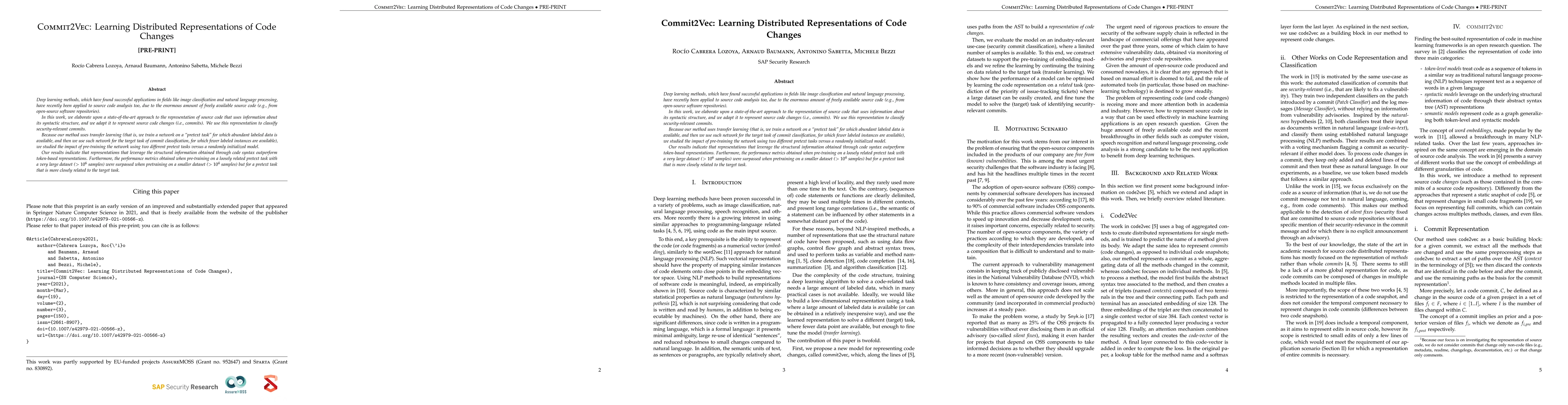 Researchers developed a method to learn distributed representations of code changes using deep learning, outperforming token-based representations in security-relevant commit classification.