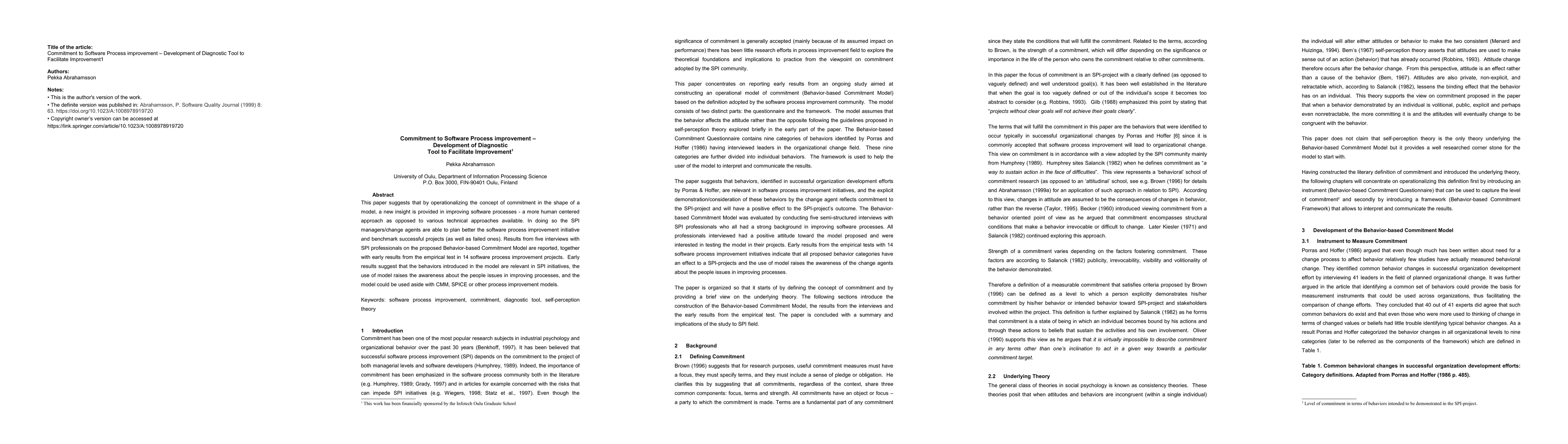 This paper suggests that by operationalizing the concept of commitment in the shape of a model, a new insight is provided in improving software processes - a more human centered approach as opposed to various technical approaches available. In doing so the SPI managers/change agents are able to plan better the software process improvement initiative and benchmark successful projects (as well as failed ones). Results from five interviews with SPI professionals on the proposed Behavior-based Commitment Model are reported, together with early results from the empirical test in 14 software process improvement projects. Early results suggest that the behaviors introduced in the model are relevant in SPI initiatives, the use of model raises the awareness about the people issues in improving processes, and the model could be used aside with CMM, SPICE or other process improvement models. Keywords: software process improvement, commitment, diagnostic tool, self-perception theory.